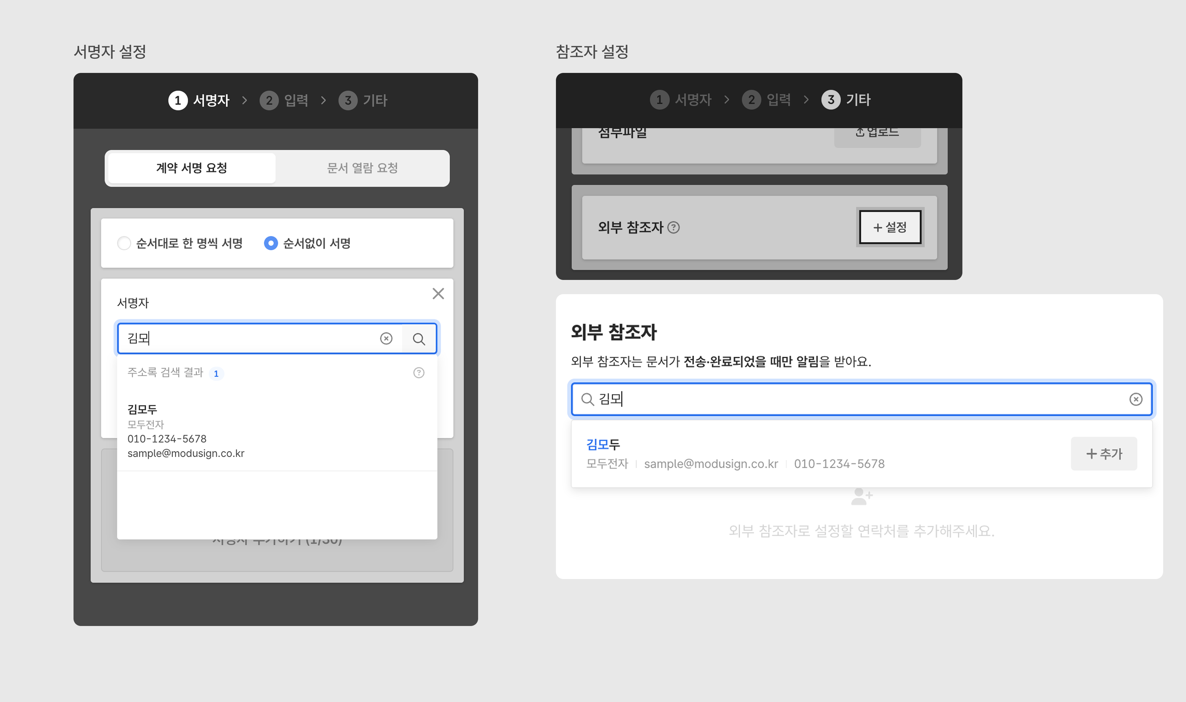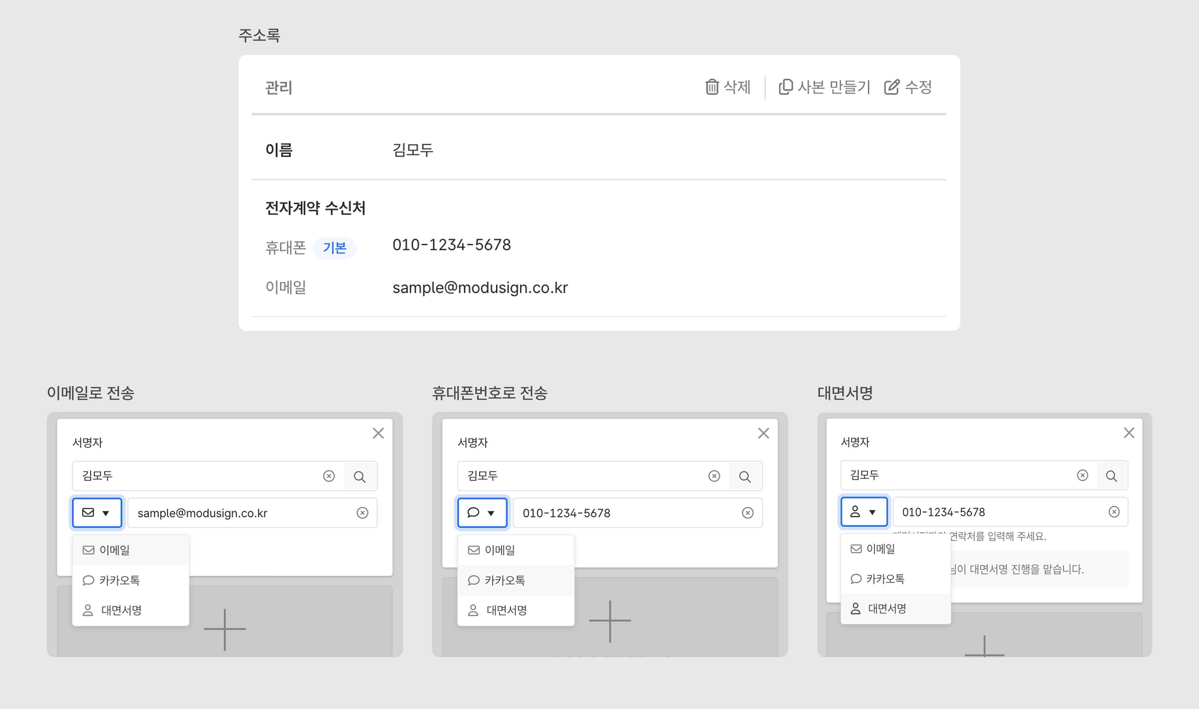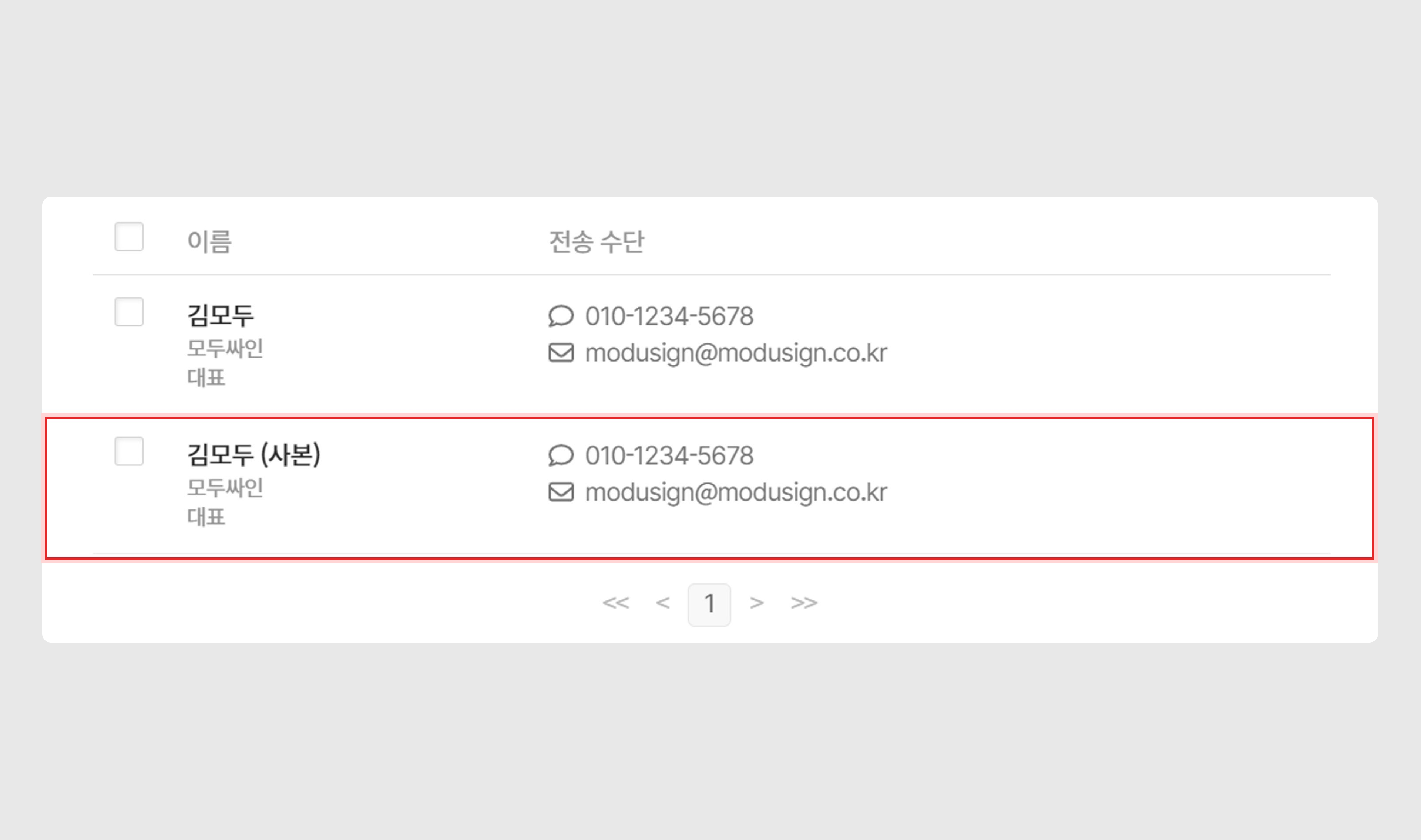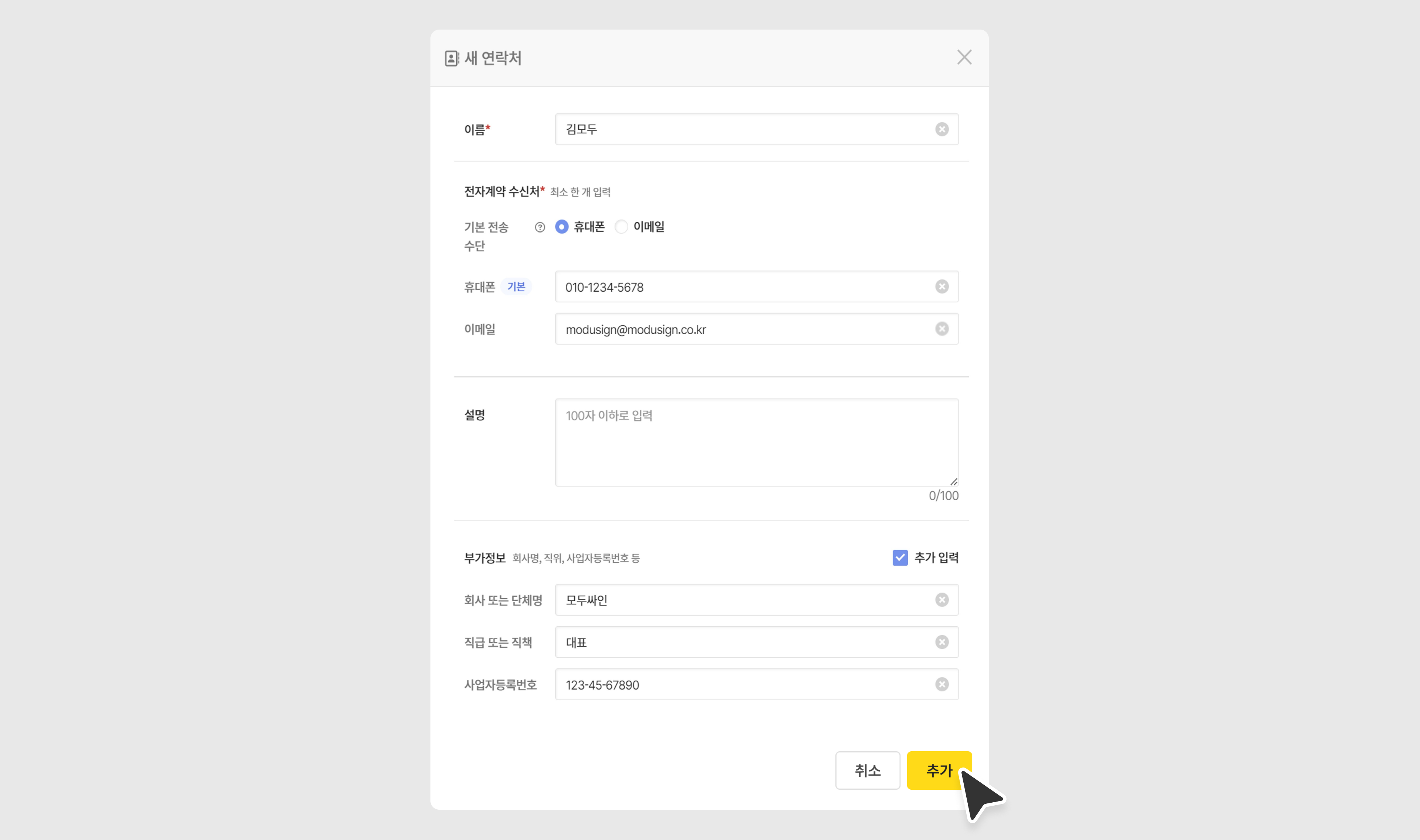 이름 : 연락처 이름을 입력합니다. 해당 이름으로 검색과 서명자 정보 입력이 진행됩니다.