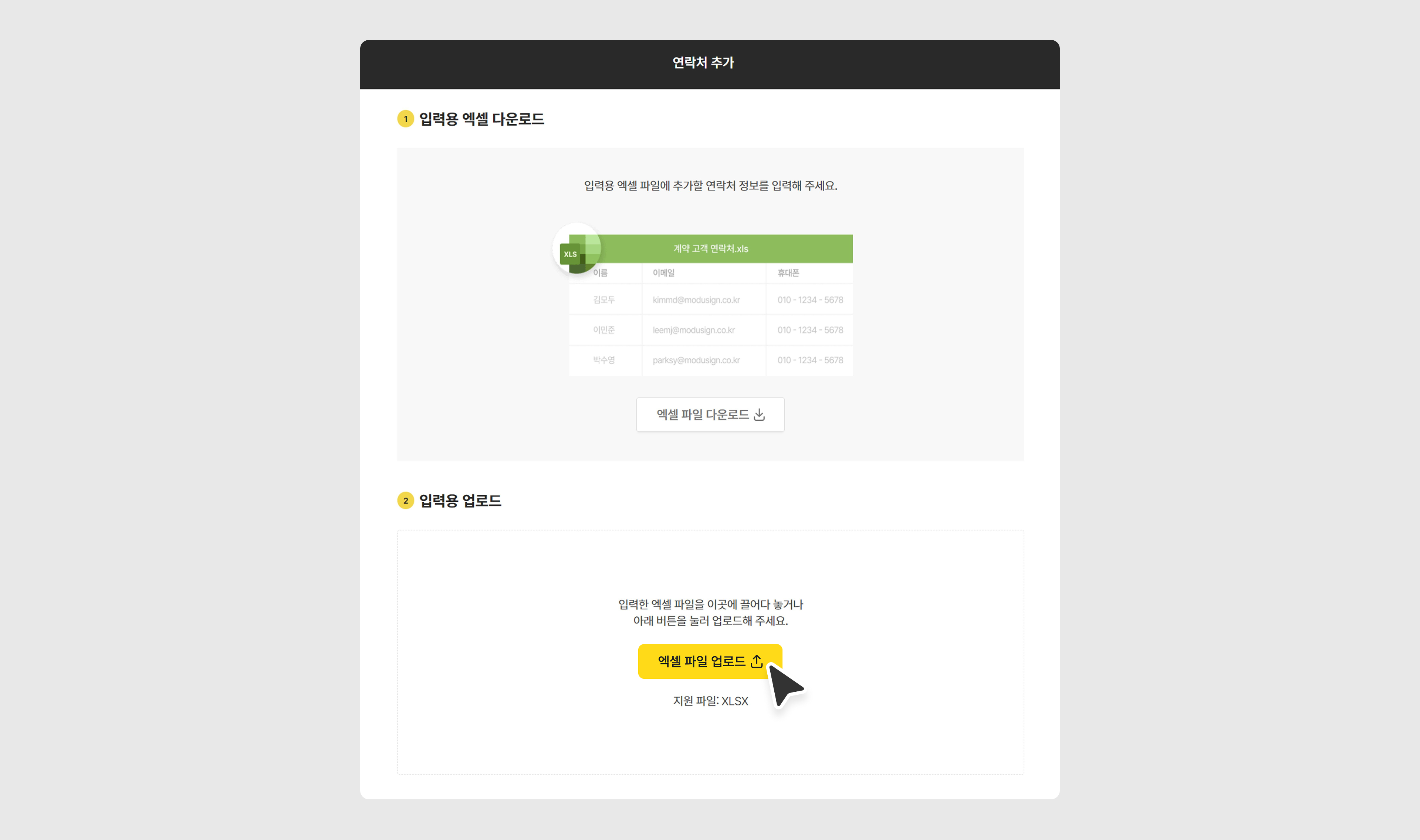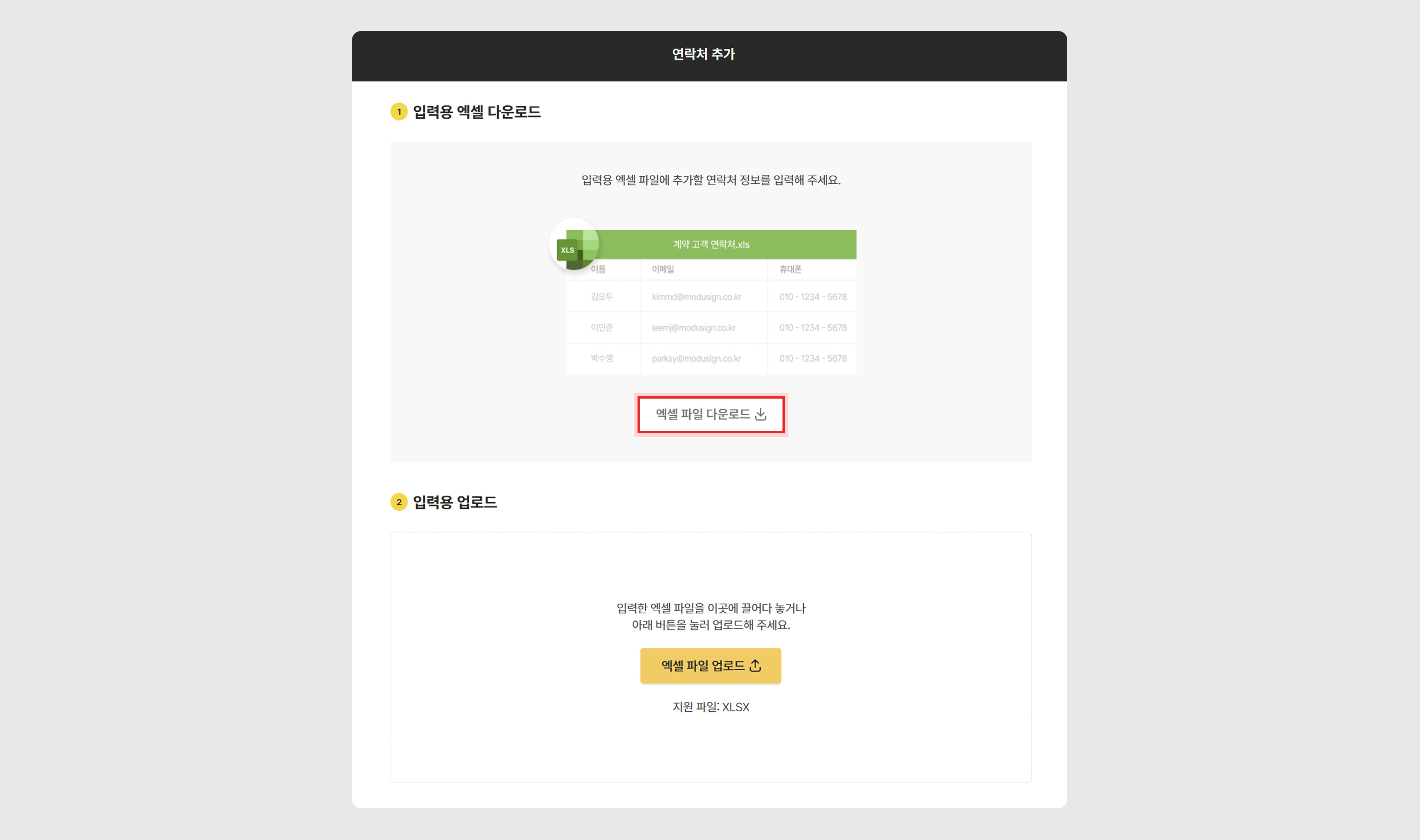 [엑셀 파일 업로드] 버튼을 눌러 연락처 정보를 입력한 엑셀 파일을 업로드합니다.