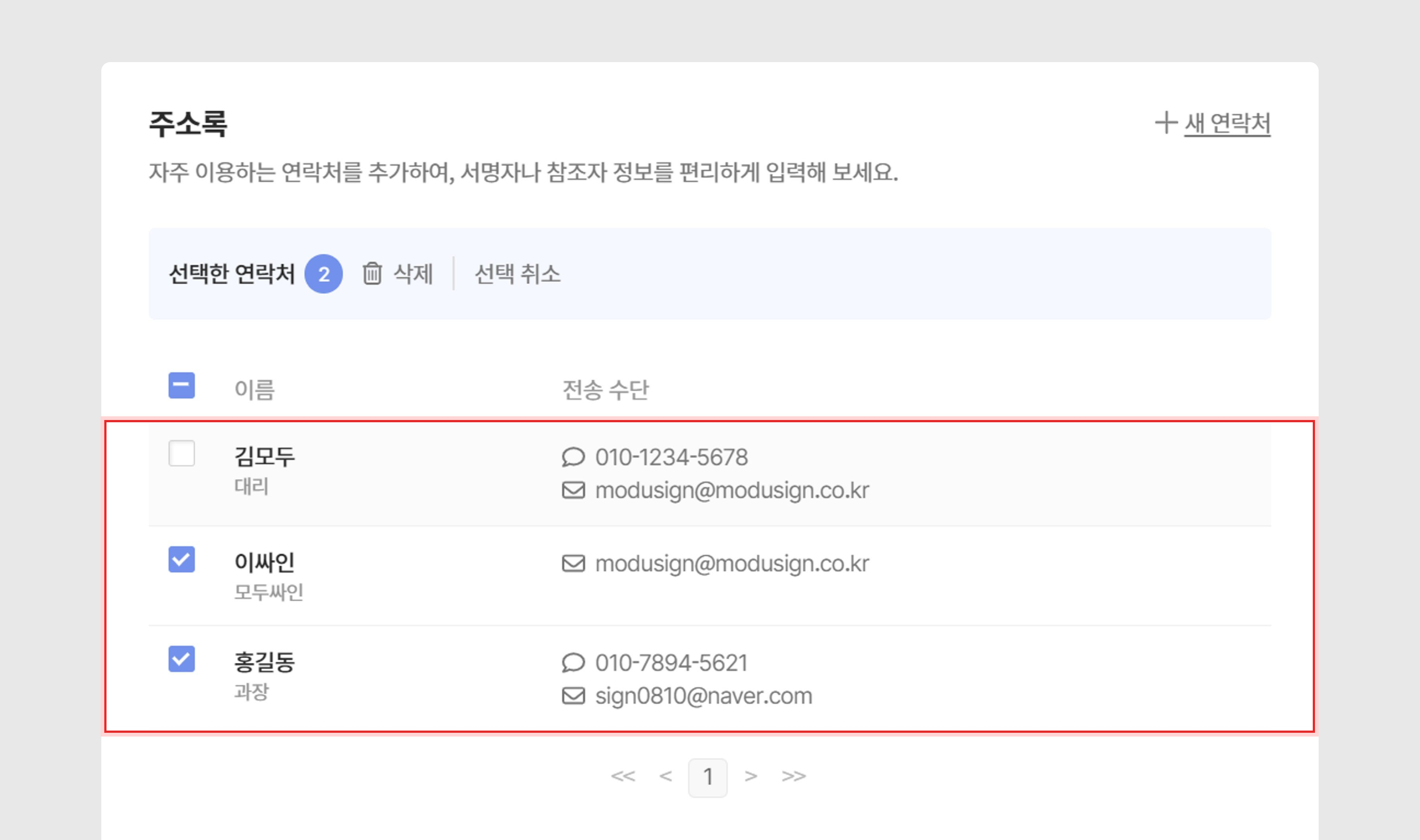 주소록 기능은 단건 서명 요청 시에만 이용하실 수 있습니다.