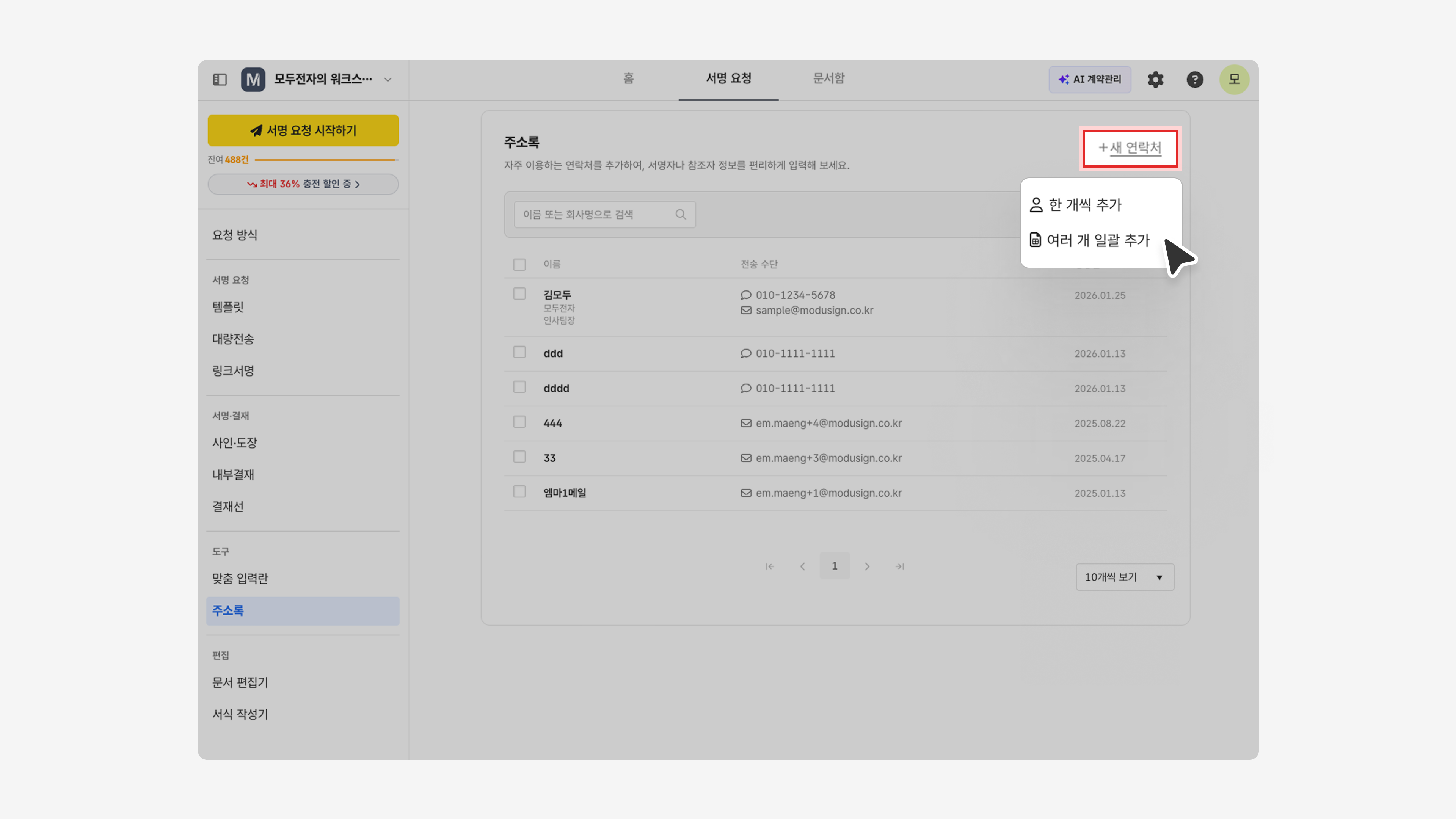상단 중앙의 '서명 요청' > 주소록 메뉴에서 [+새 연락처] 버튼 내 [한 개씩 추가] 를 클릭합니다.