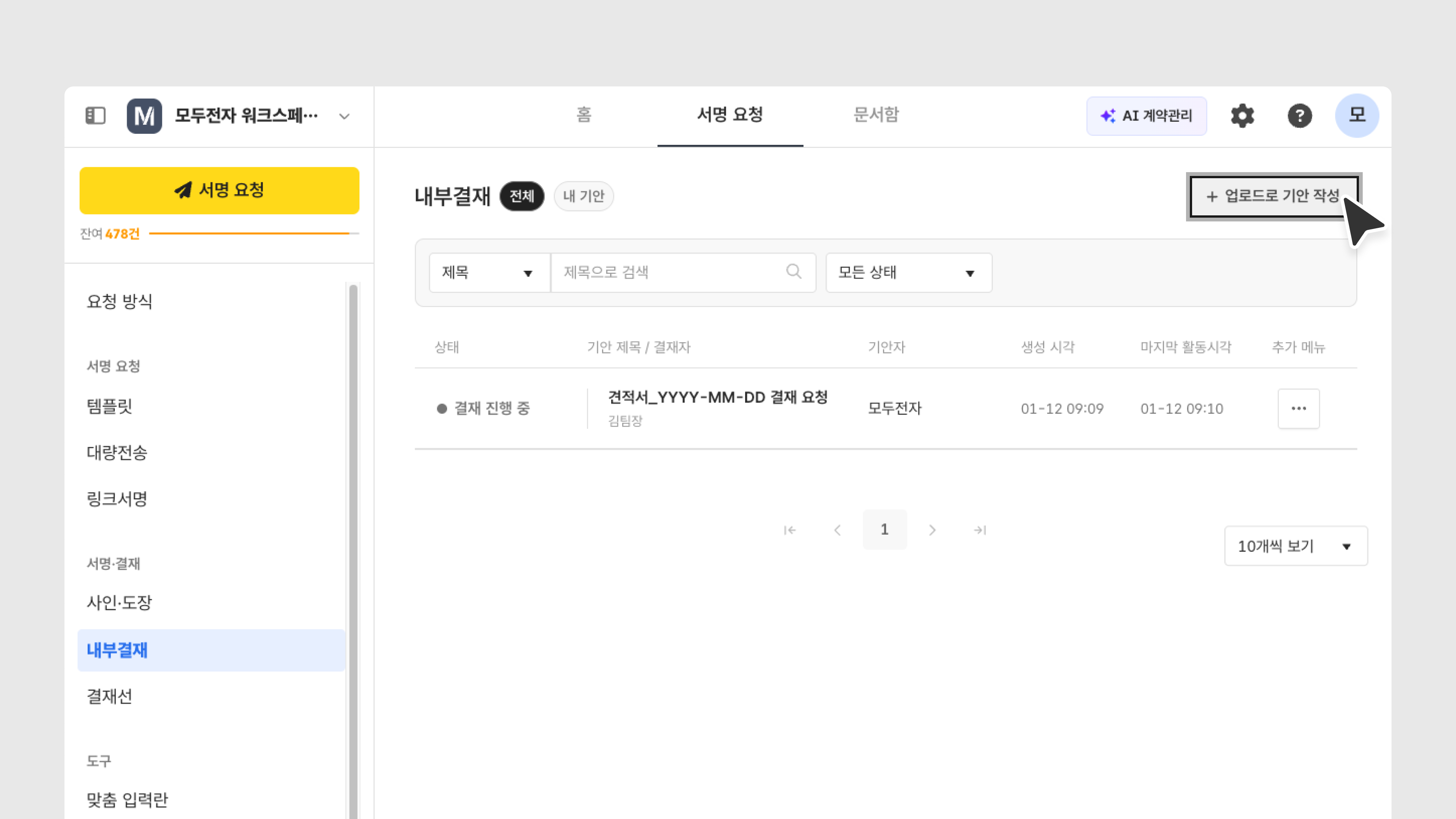 우측 상단의 [업로드로 기안 작성]을 클릭한 후, 서명 요청할 문서를 업로드합니다.