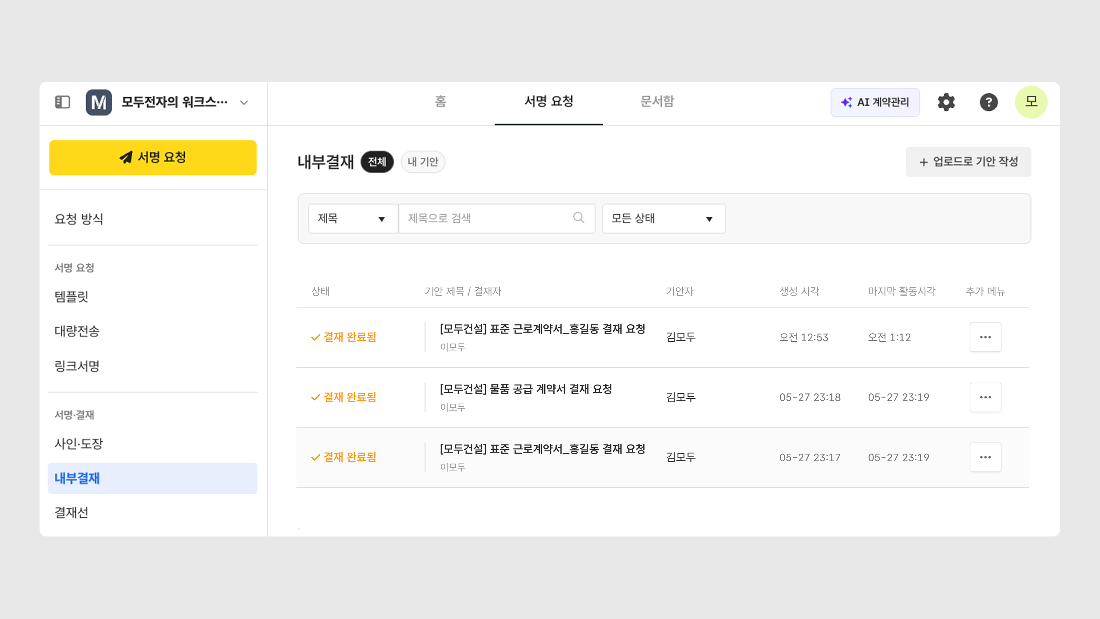 모든 결재자가 결재를 승인하면, 기안 문서는 ‘결재 완료됨’으로 상태가 변경되며, 서명자에게 서명 요청이 전송됩니다.