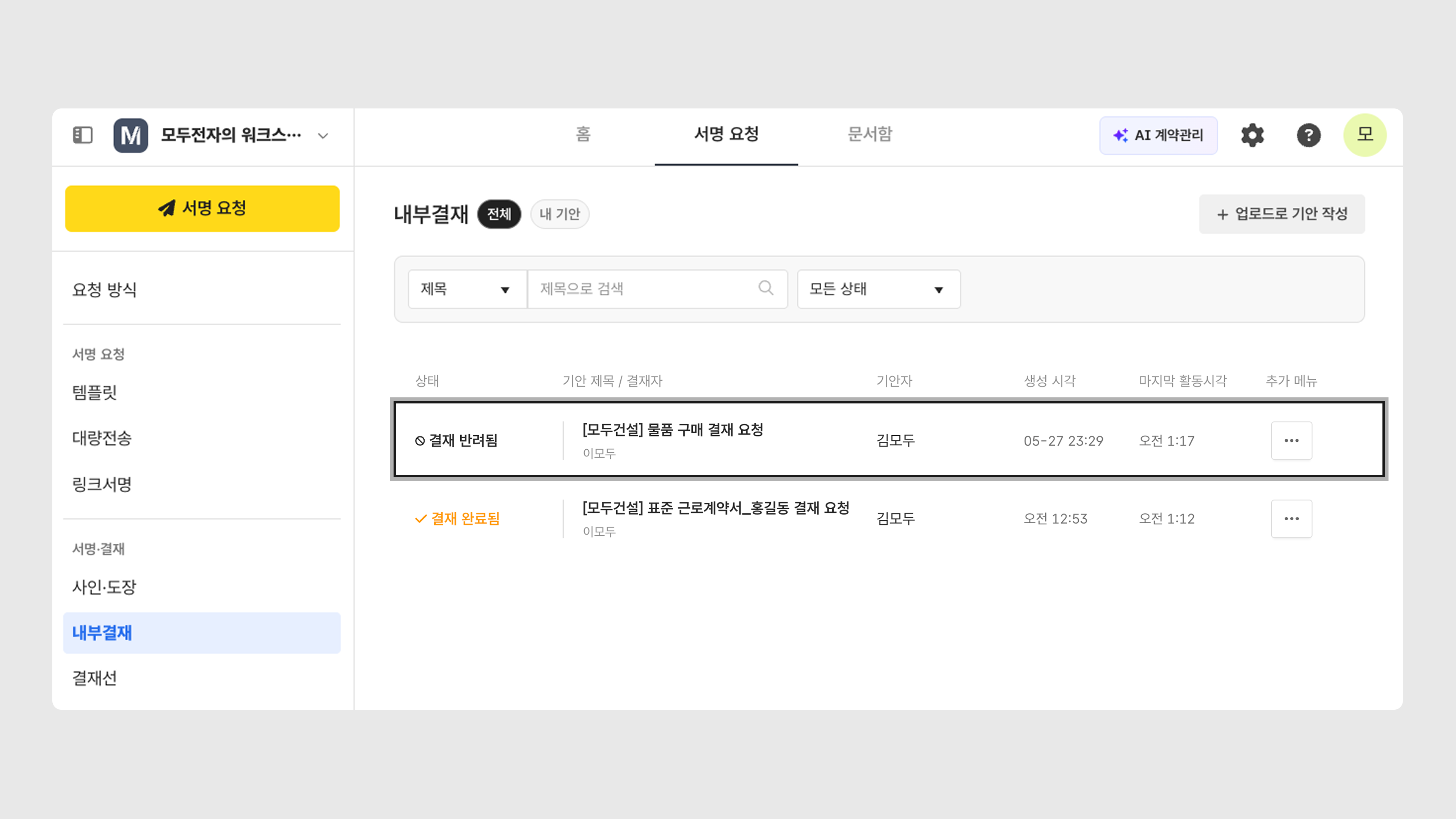 서명자에 문서 발송 전, 내부결재를 통해 결재자의 기안 승인 후 서명 요청을 진행할 수 있습니다.