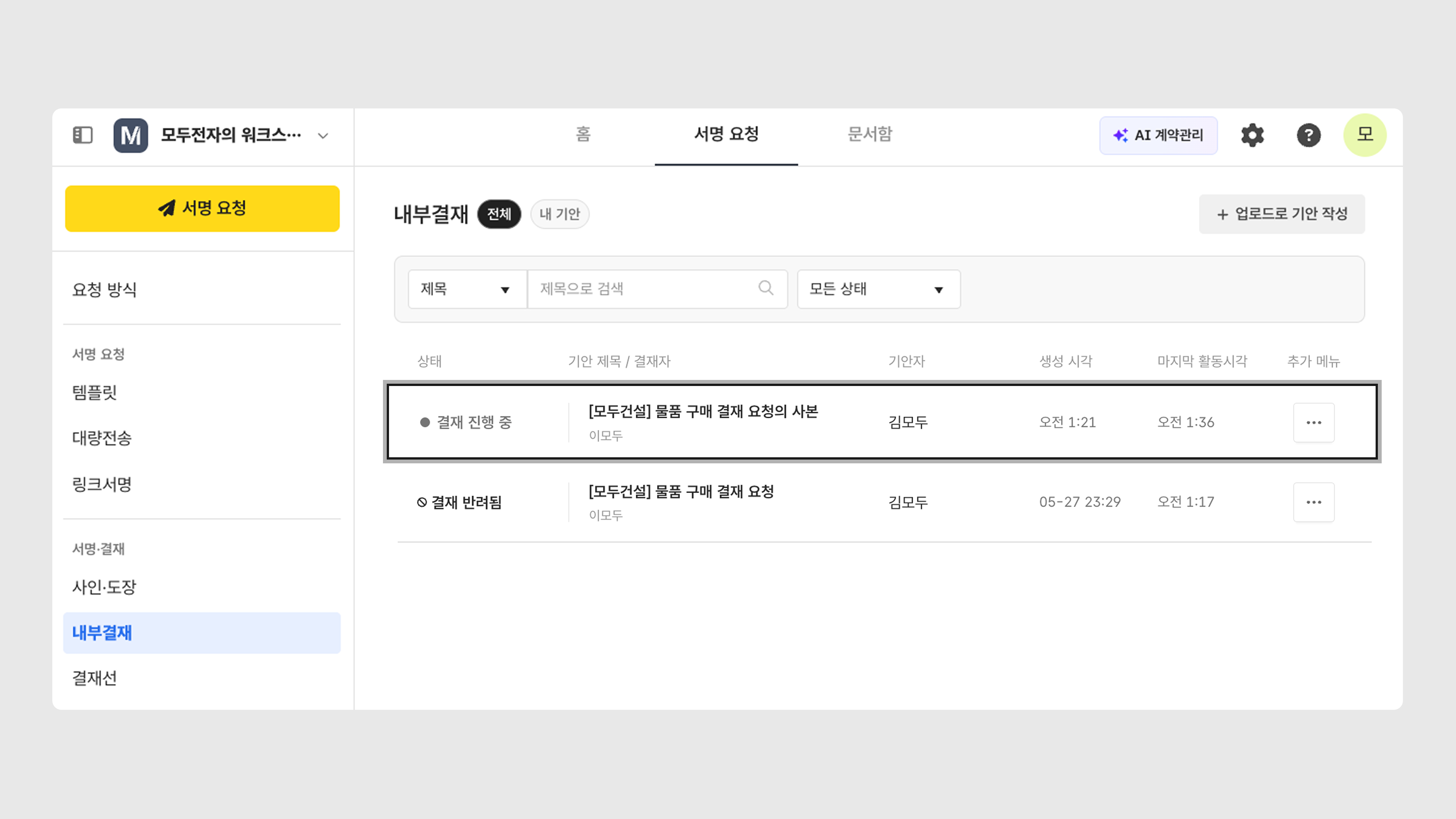 상단의 '서명 요청' 메뉴 > 좌측 [내부결재] 메뉴를 클릭합니다.