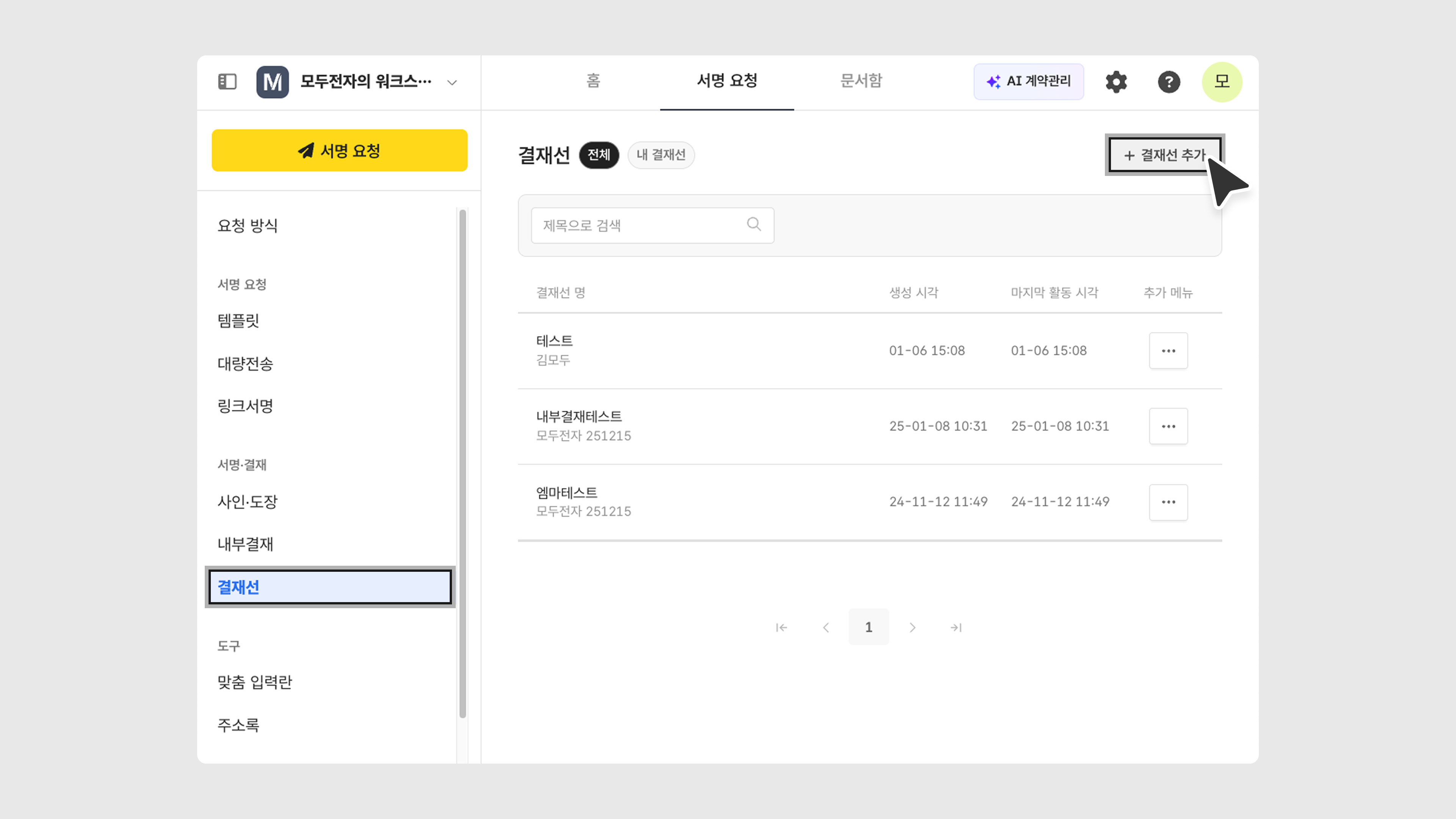 상단의 '서명 요청' 메뉴 > 좌측 [결재선] 메뉴를 클릭합니다.