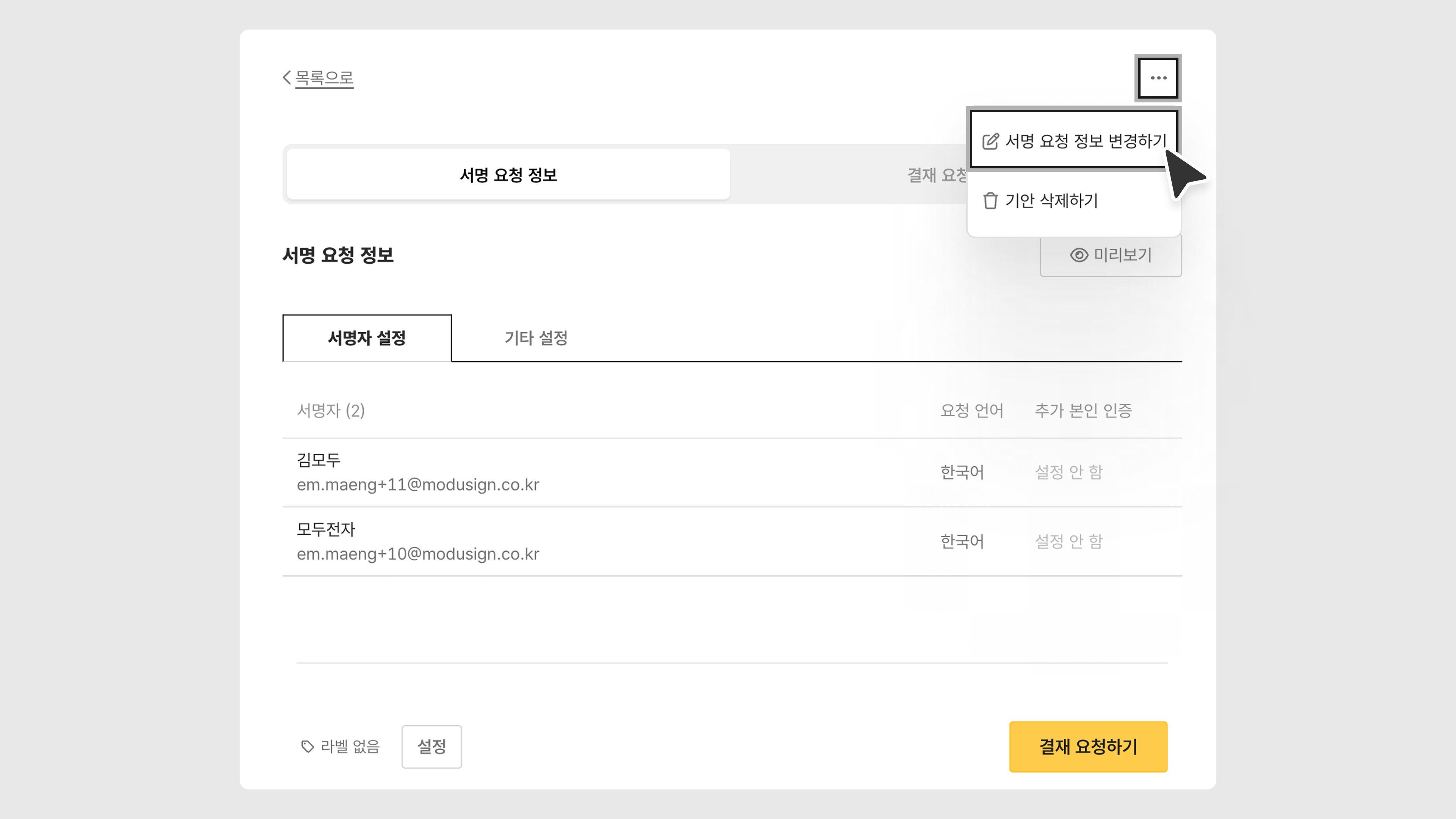 결재 요청 전 문서 클릭 후, 서명 요청 정보 탭 > 우측 상단 [...] 클릭 > [서명 요청 정보 변경하기] 버튼을 클릭합니다.