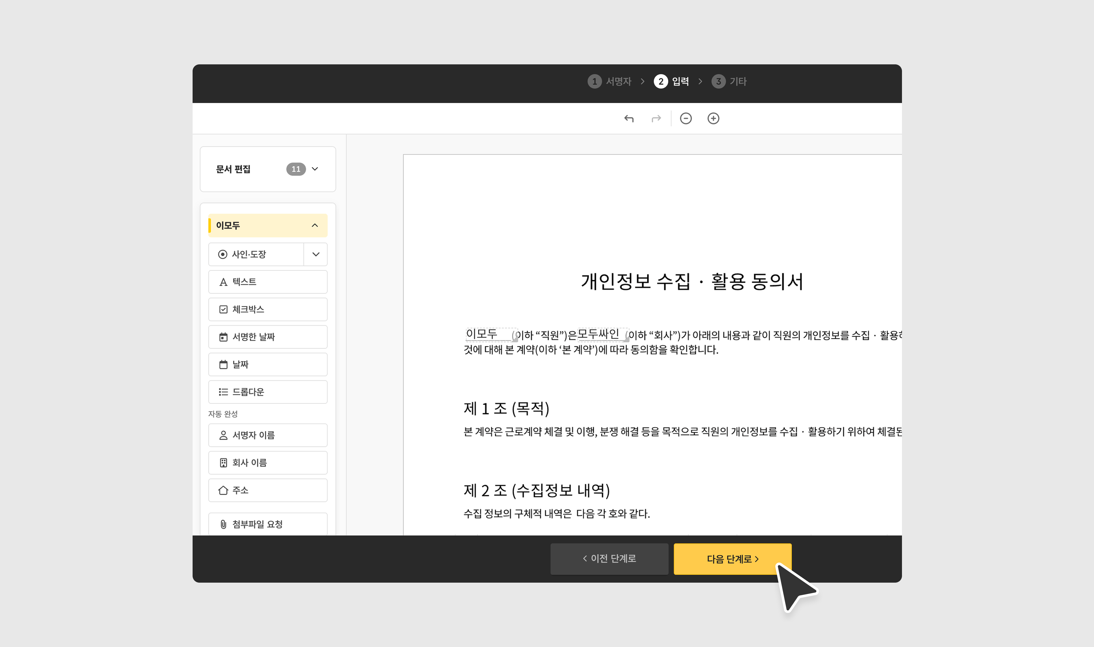 '사인/도장 없는 서명자 기능'은, 서명자에게 '서명 날인'은 요청하지 않더라도, 텍스트/ 체크박스 등의 입력란을 추가하여 입력 요청할 수 있습니다.