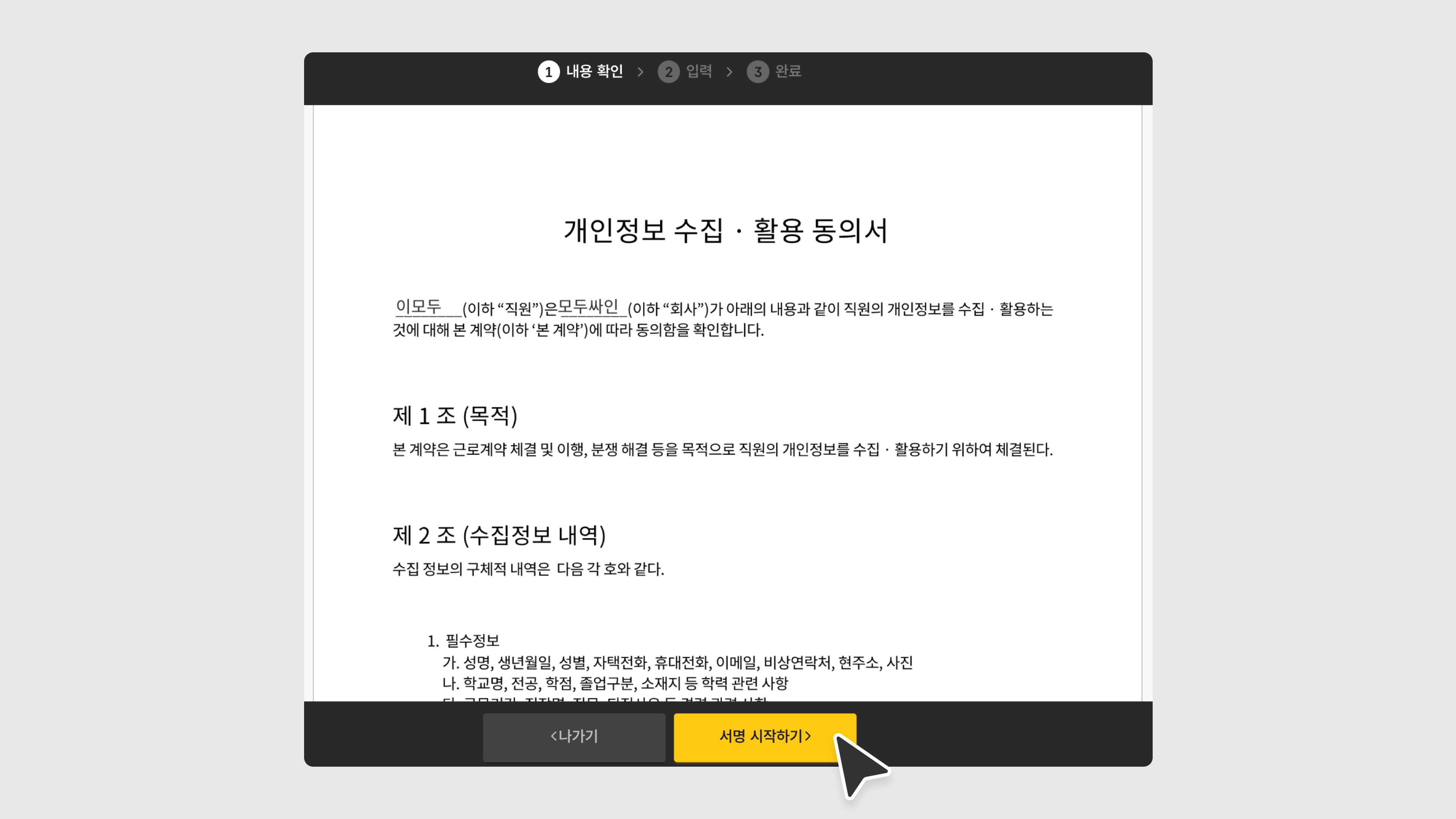 확인 완료 버튼 클릭 후, 전자서명에 대한 [동의하고 서명 완료 >] 버튼을 누르면 문서 확인 및 서명이 완료됩니다.