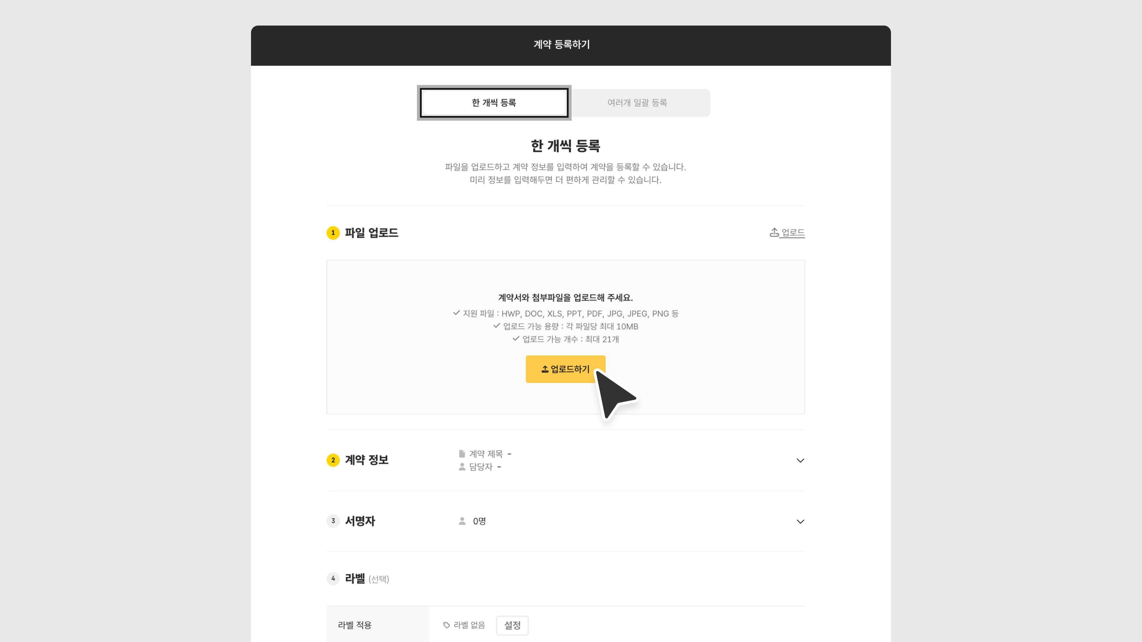 업로드한 계약서 및 첨부파일의 라벨을 설정 후 [등록하기] 버튼을 클릭하여 완료합니다.