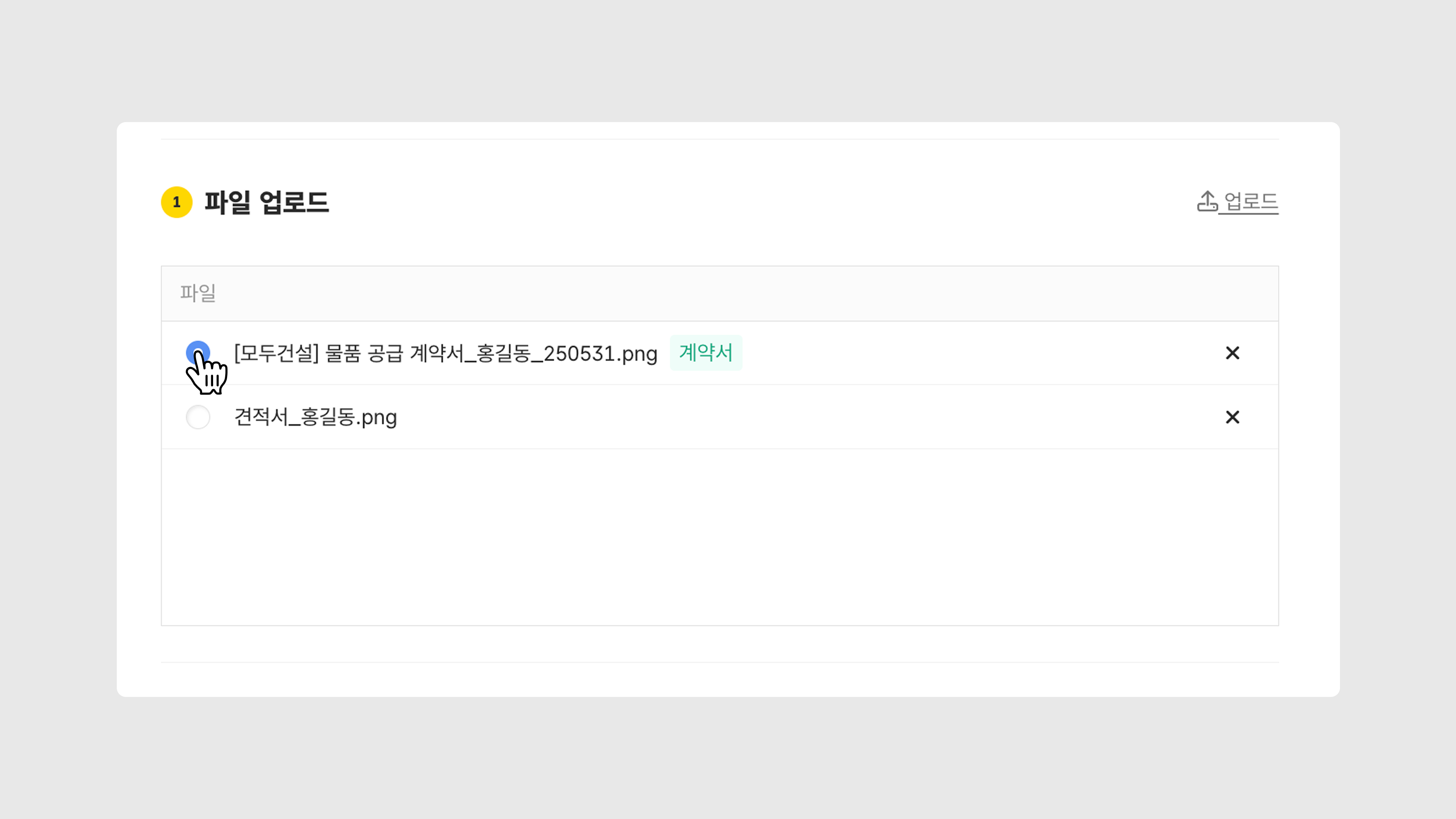 계약서와 첨부파일 중, 계약서로 설정할 1개 파일을 선택합니다.