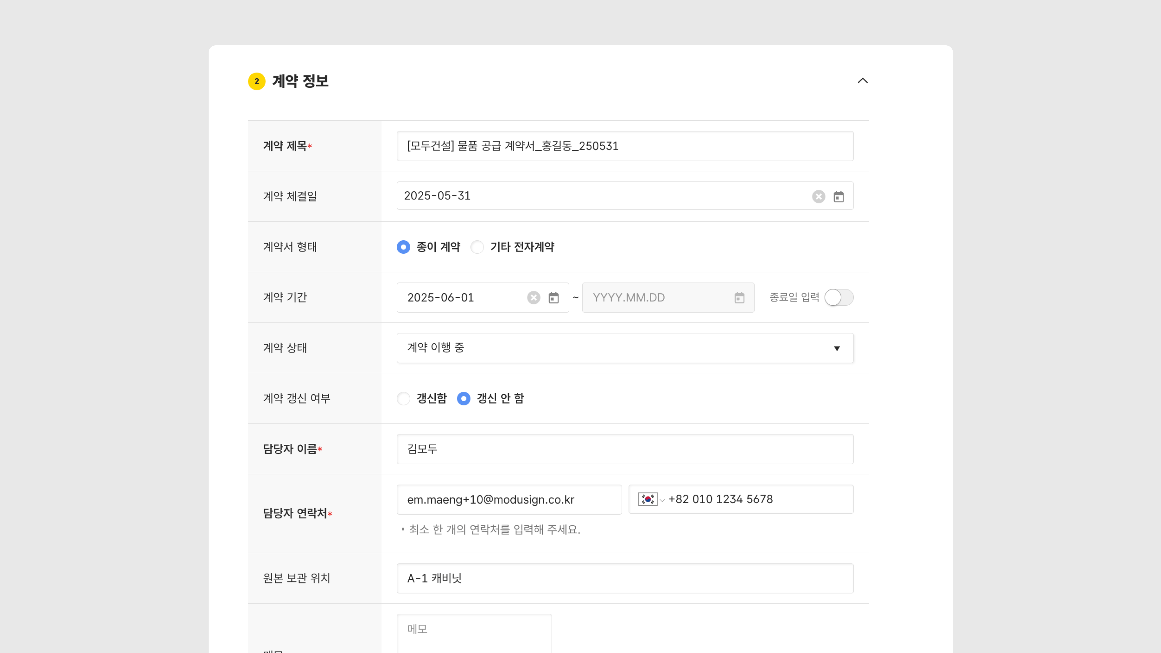 계약 제목 : "최상위 폴더명_하위 폴더명" 으로 임의 생성된 계약 제목을 변경할 수 있습니다.