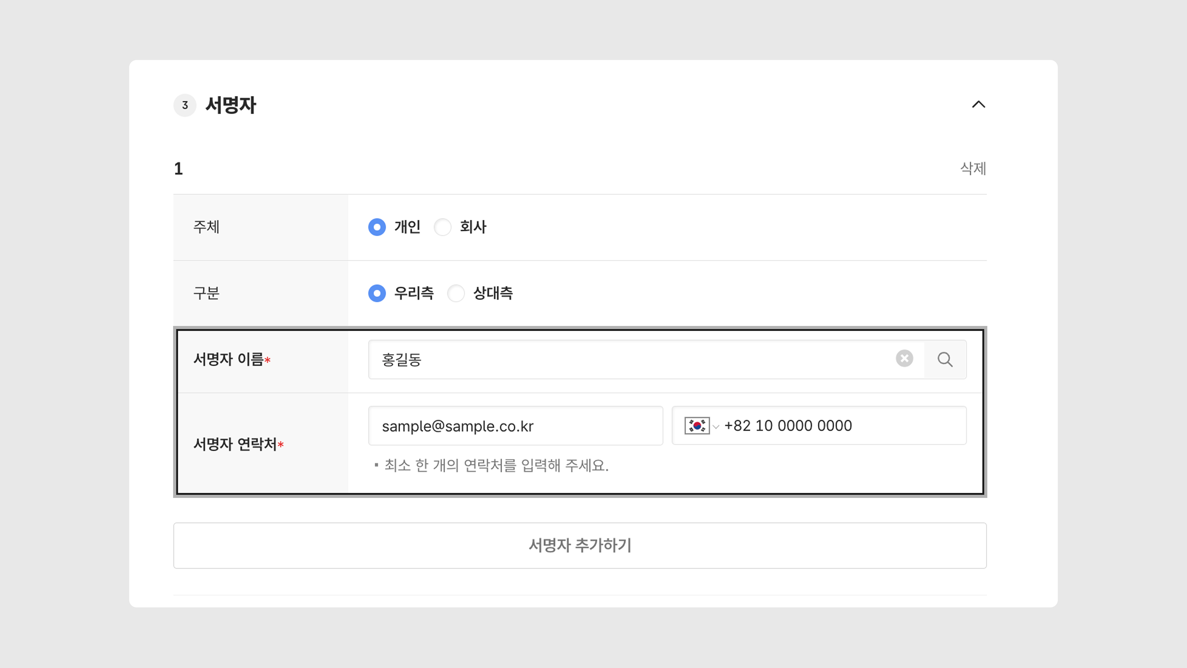 서명 주체가 개인일 경우, 서명자 이름과 연락처를 필수로 입력합니다.