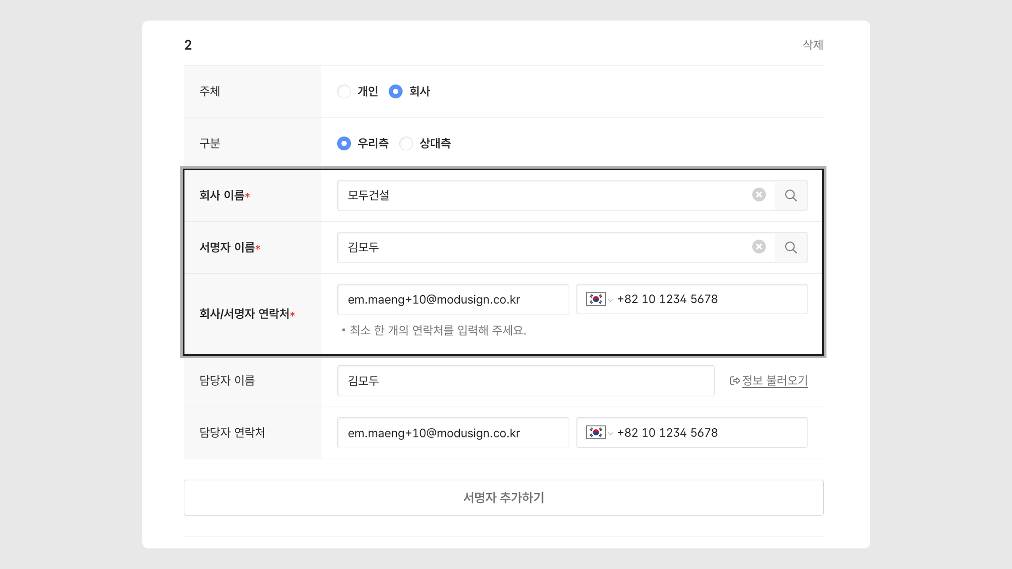 서명 주체가 회사일 경우, 회사 이름 / 서명자 이름 / 회사, 서명자 연락처(이메일 혹은 전화번호 중 최소 한 개의 연락처)를 필수로 입력합니다.