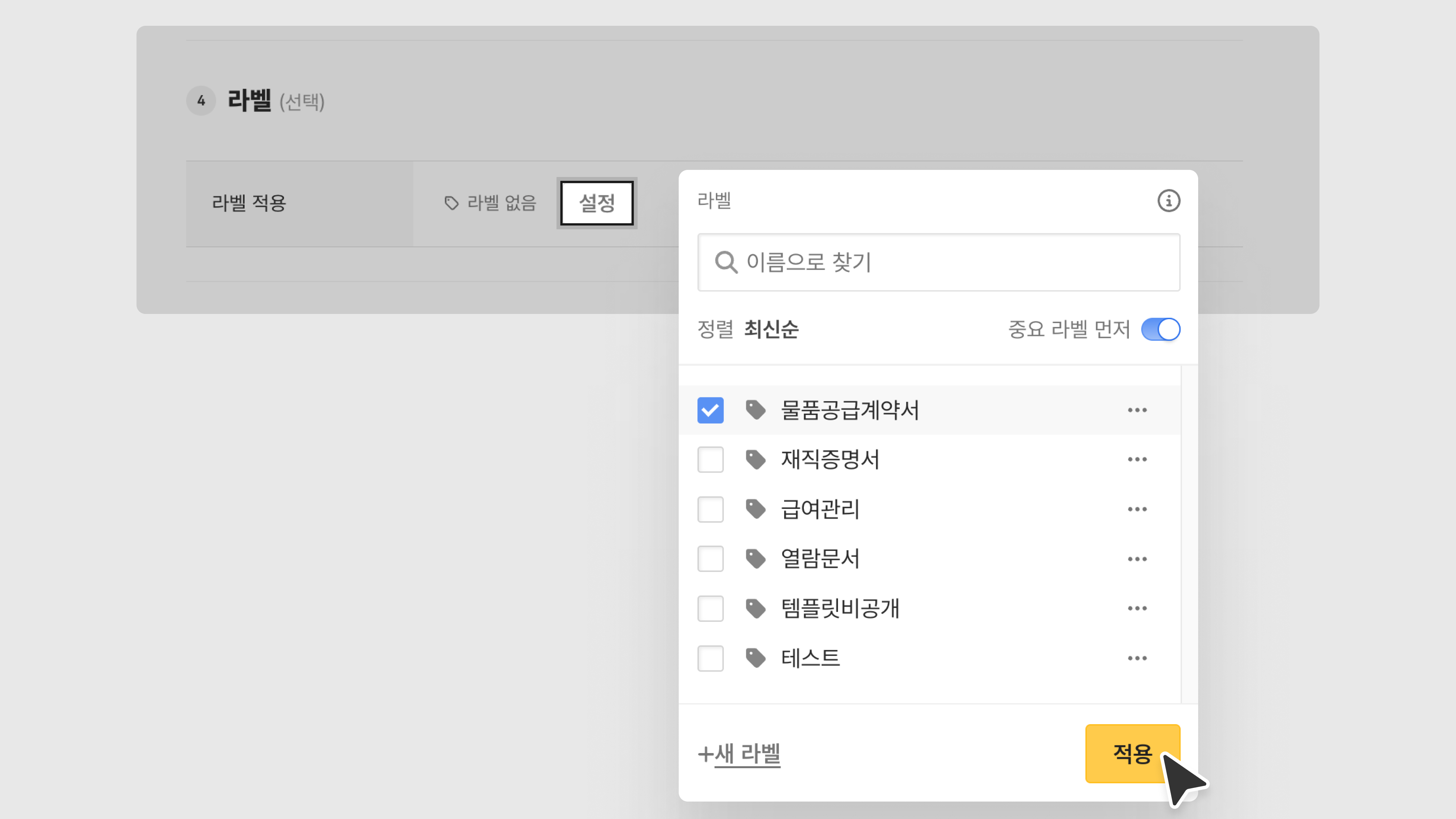 업로드한 계약서 및 첨부파일의 라벨을 선택합니다.