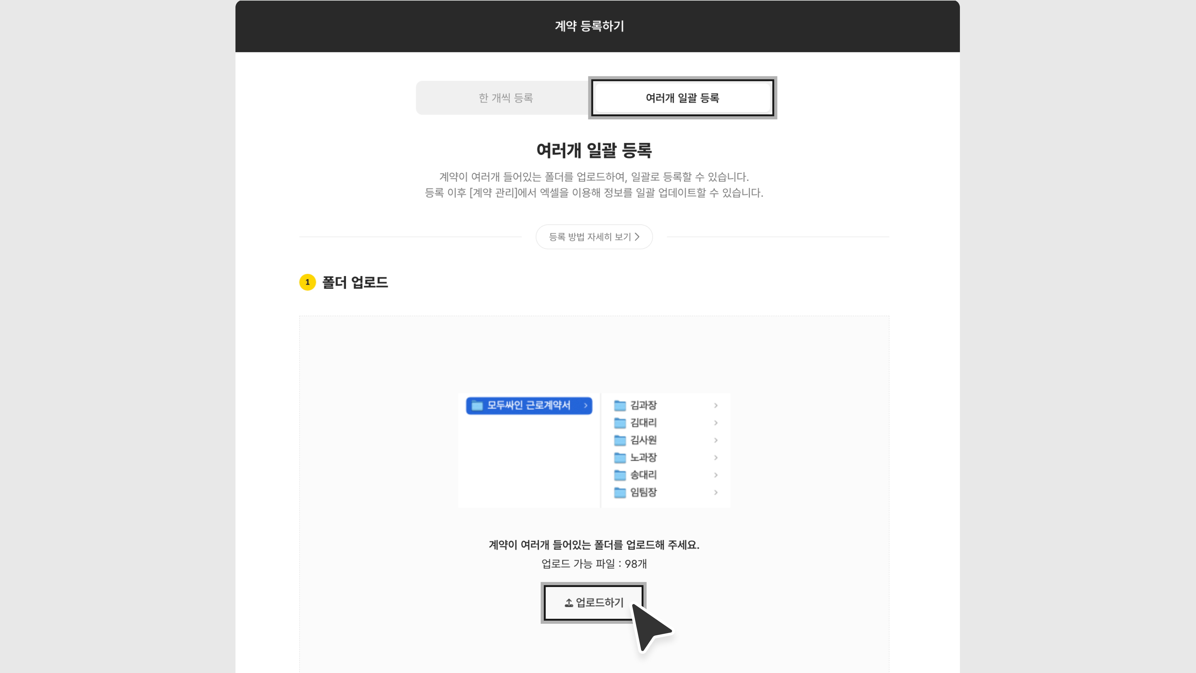 [계약 등록] 버튼 클릭, [여러 개 일괄 등록] > [업로드하기] 버튼을 클릭합니다.