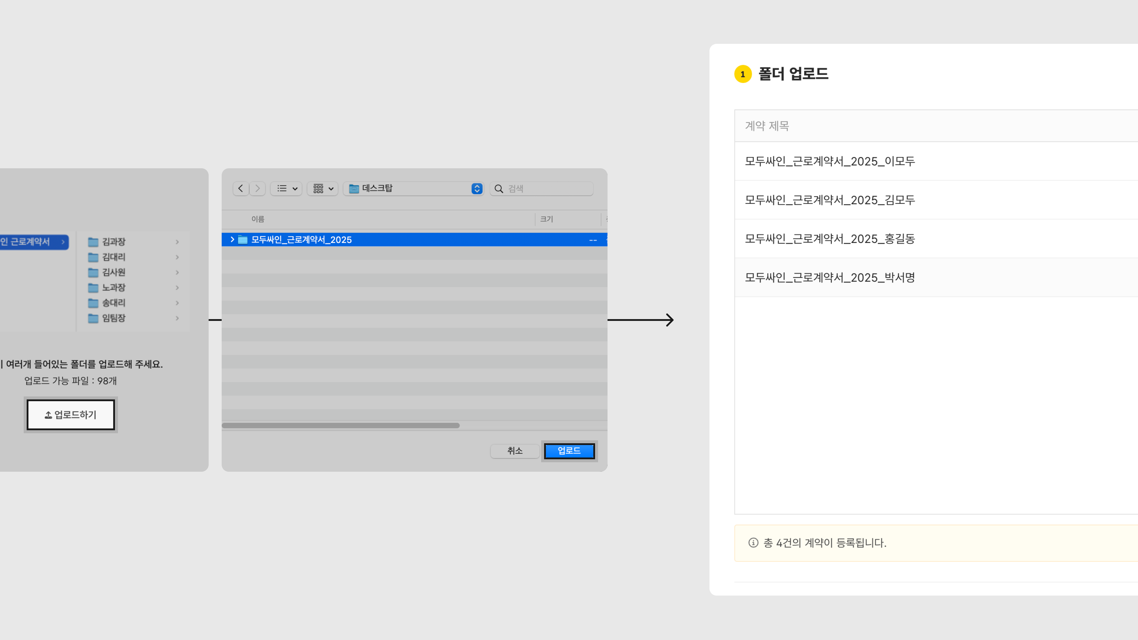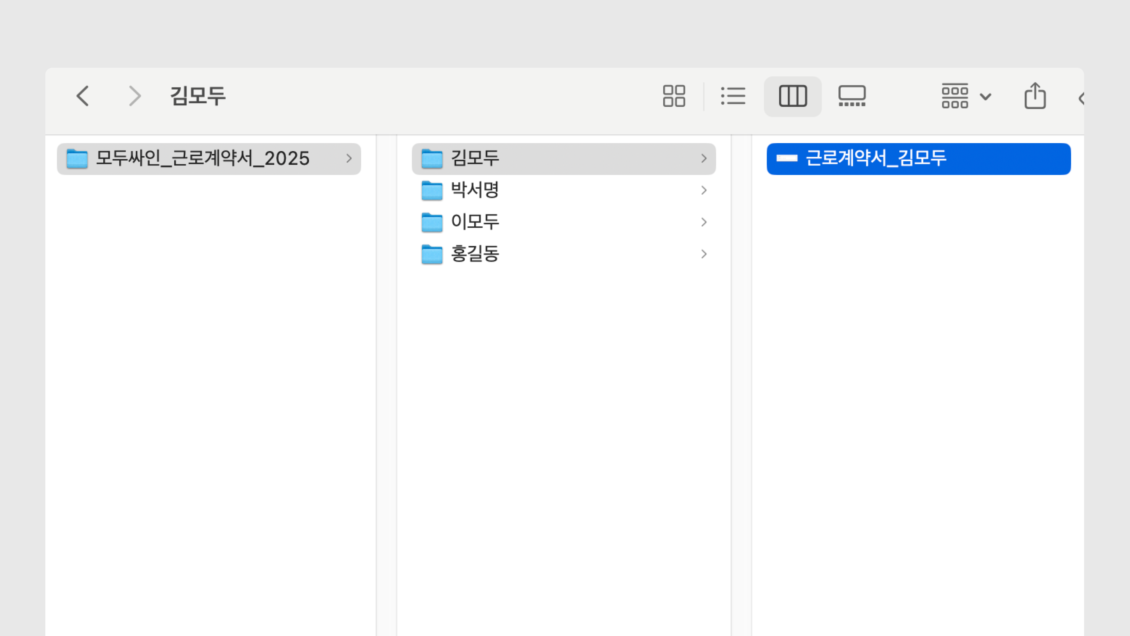 └ 홍길동 (하위 폴더) └ 홍길동_계약서 (파일1) └ 홍길동_개인정보동의서 (파일2) └ 홍길동_통장사본 (파일3)