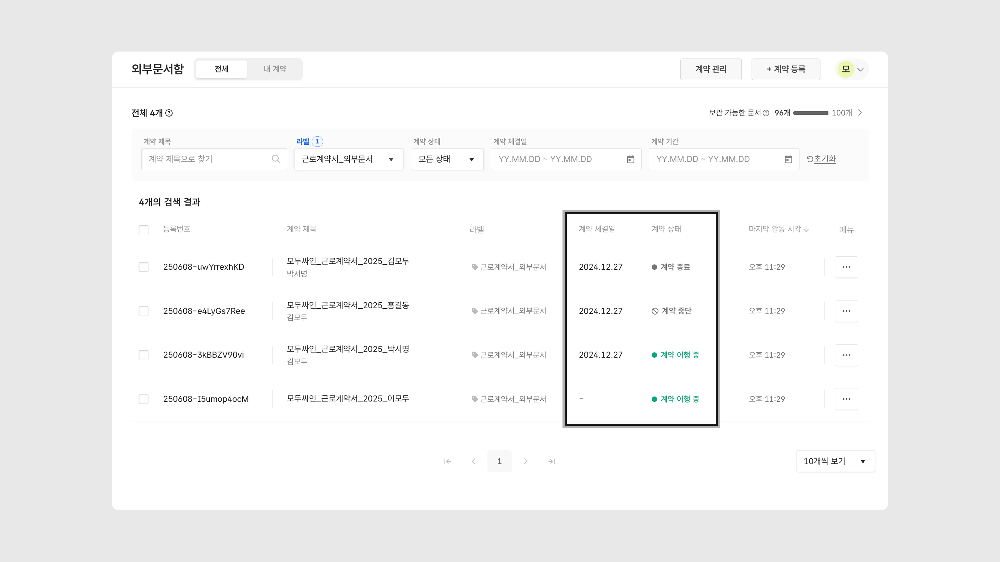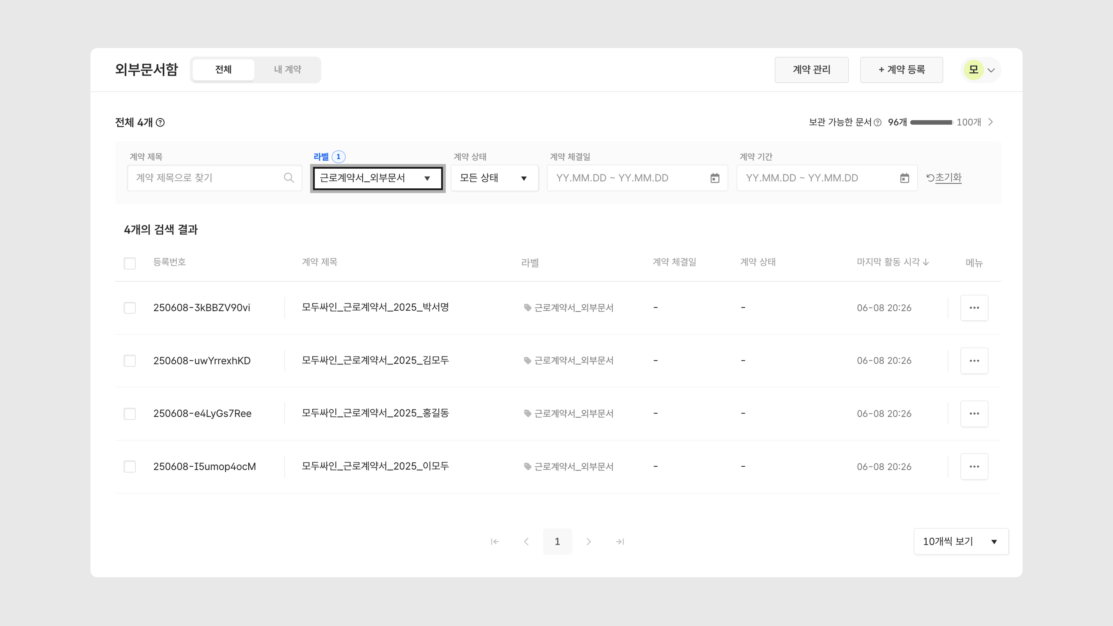 계약 등록 완료 후, 설정한 라벨로 필터링하면 계약 정보가 입력되지 않은 상태의 외부 문서를 확인할 수 있습니다.