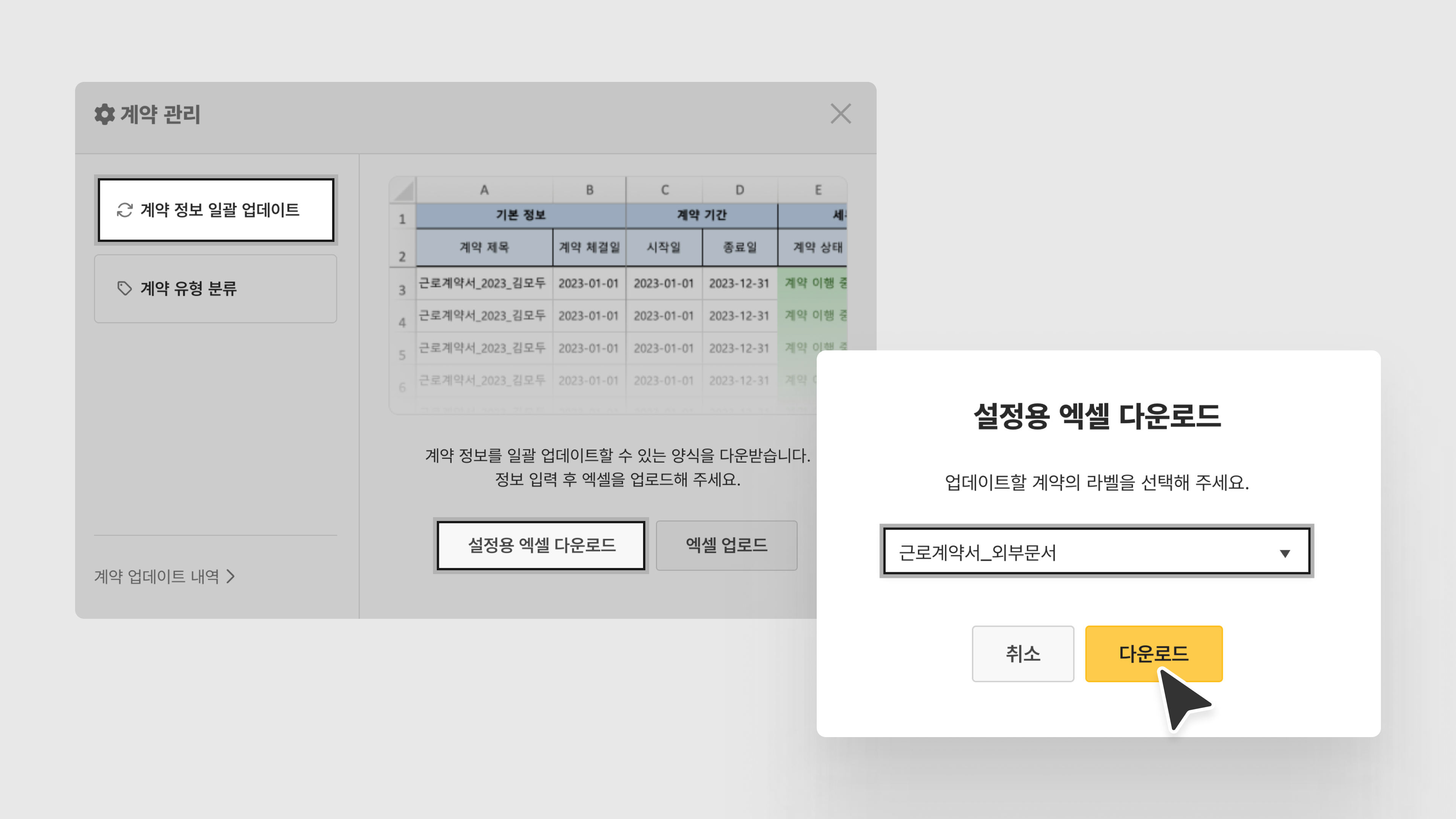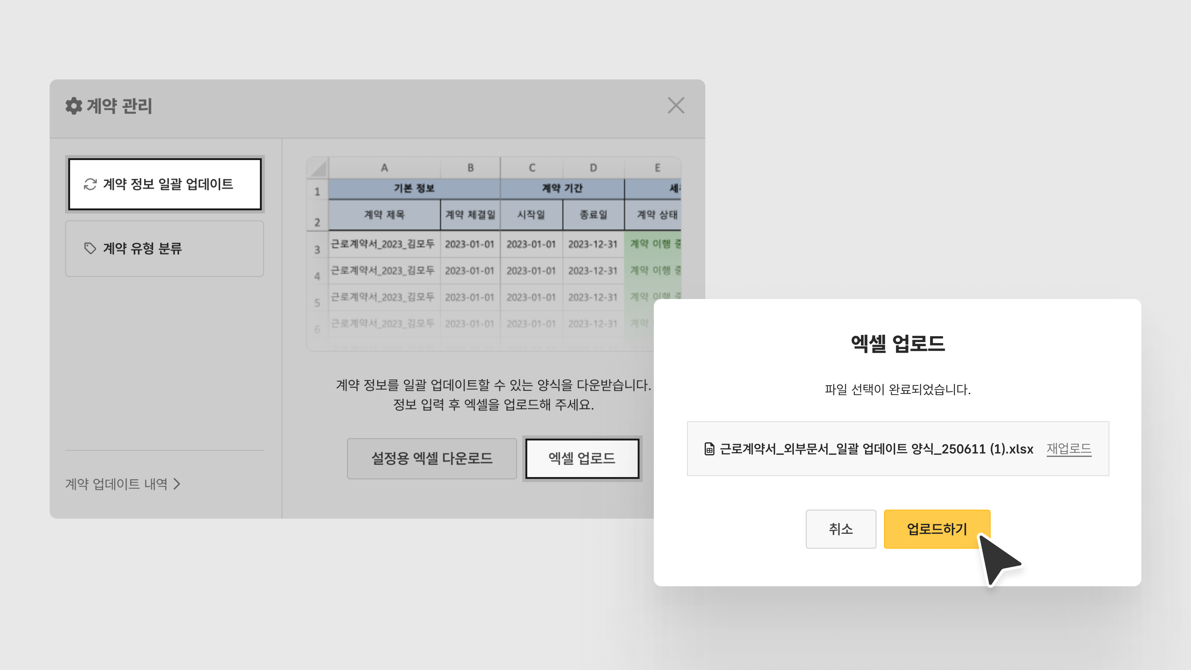 [계약 관리] 버튼을 누른 후, 계약 정보 일괄 업데이트 탭에서 [엑셀 업로드]를 클릭합니다.