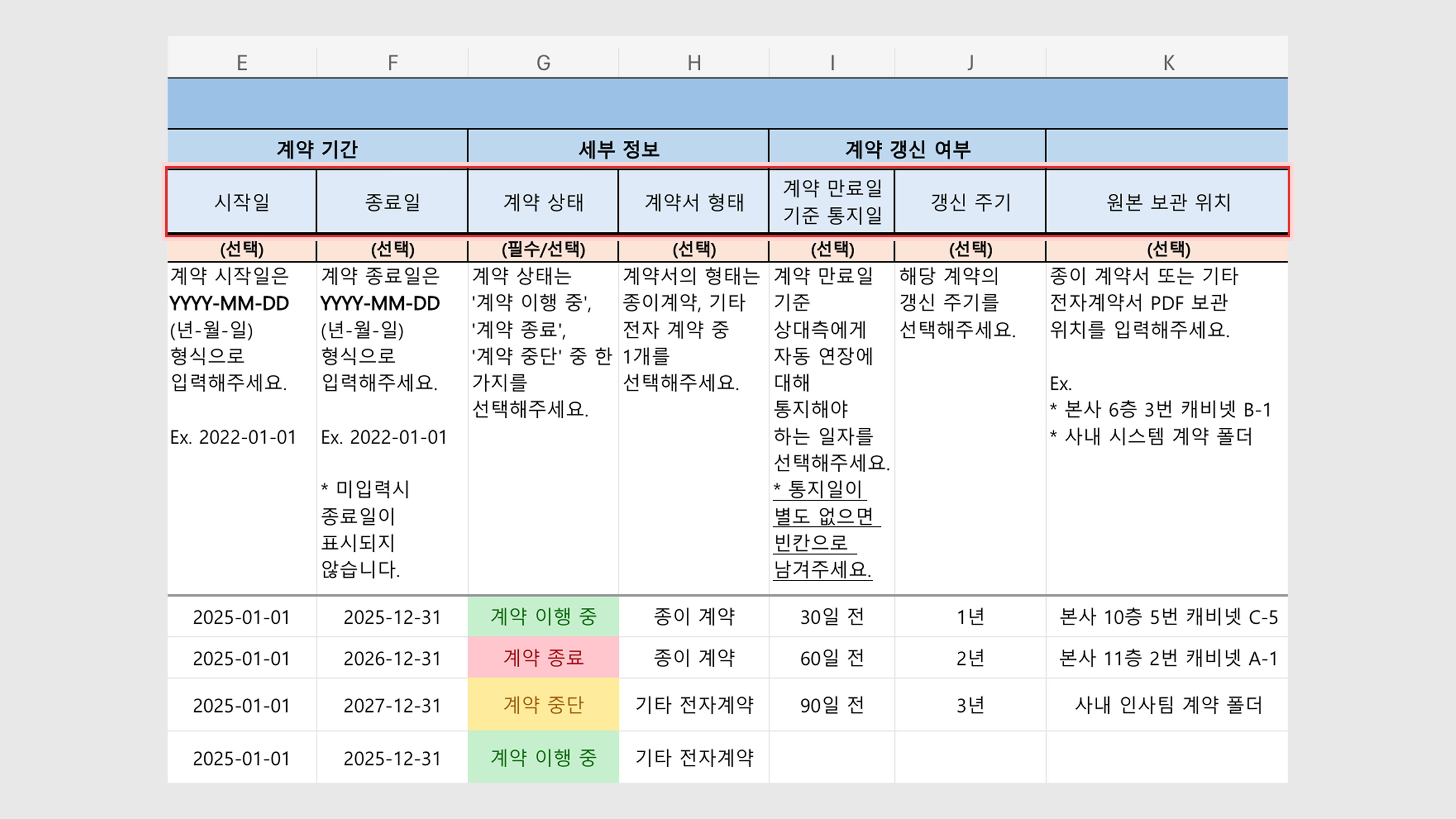 종료일 : 외부 문서 계약 종료일을 YYYY-MM-DD 형식으로 입력합니다. 미입력 시, 종료일이 표시되지 않습니다.