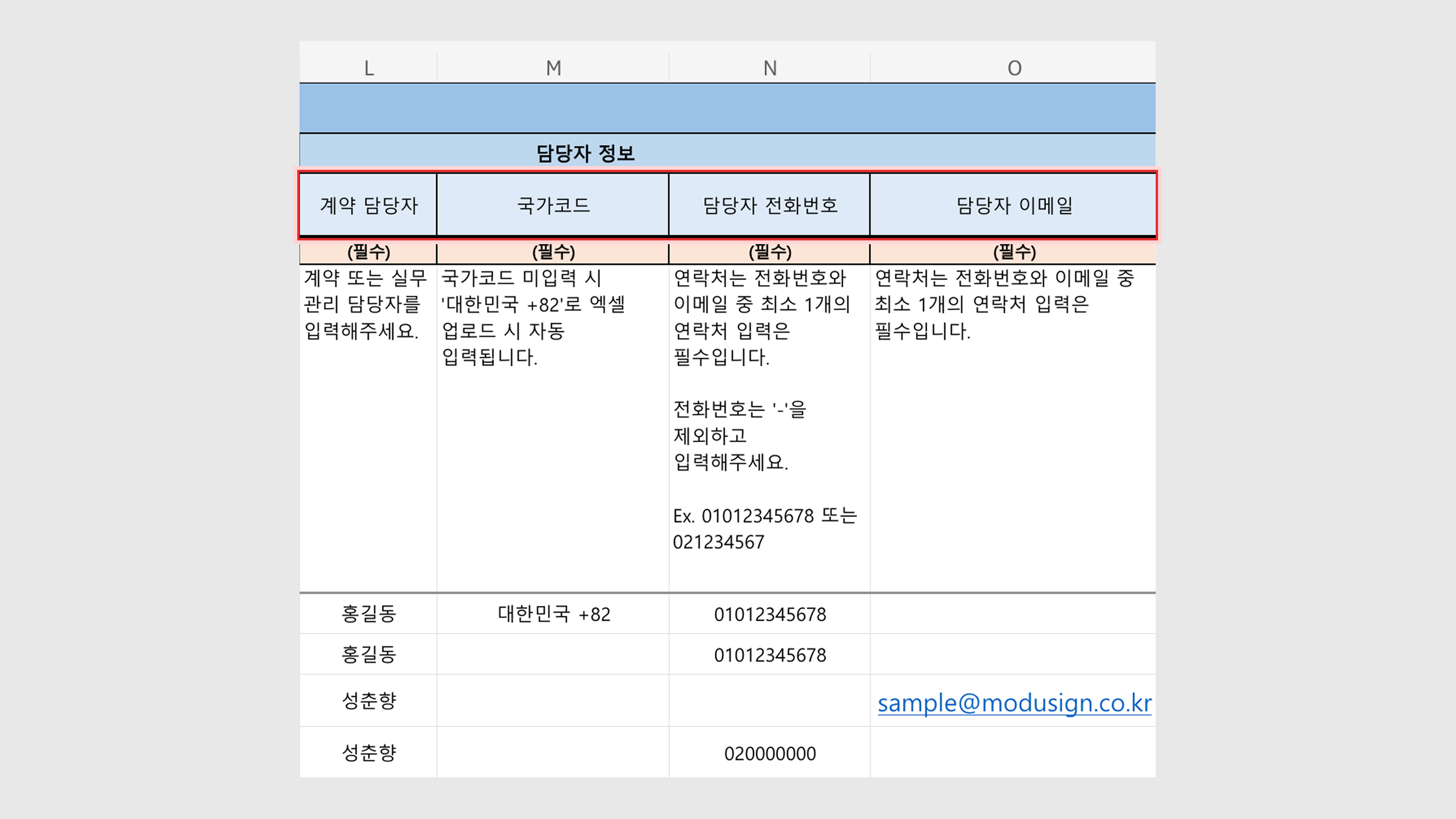 다운로드한 설정용 엑셀 파일 실행 후, 업데이트할 계약 정보를 입력합니다.