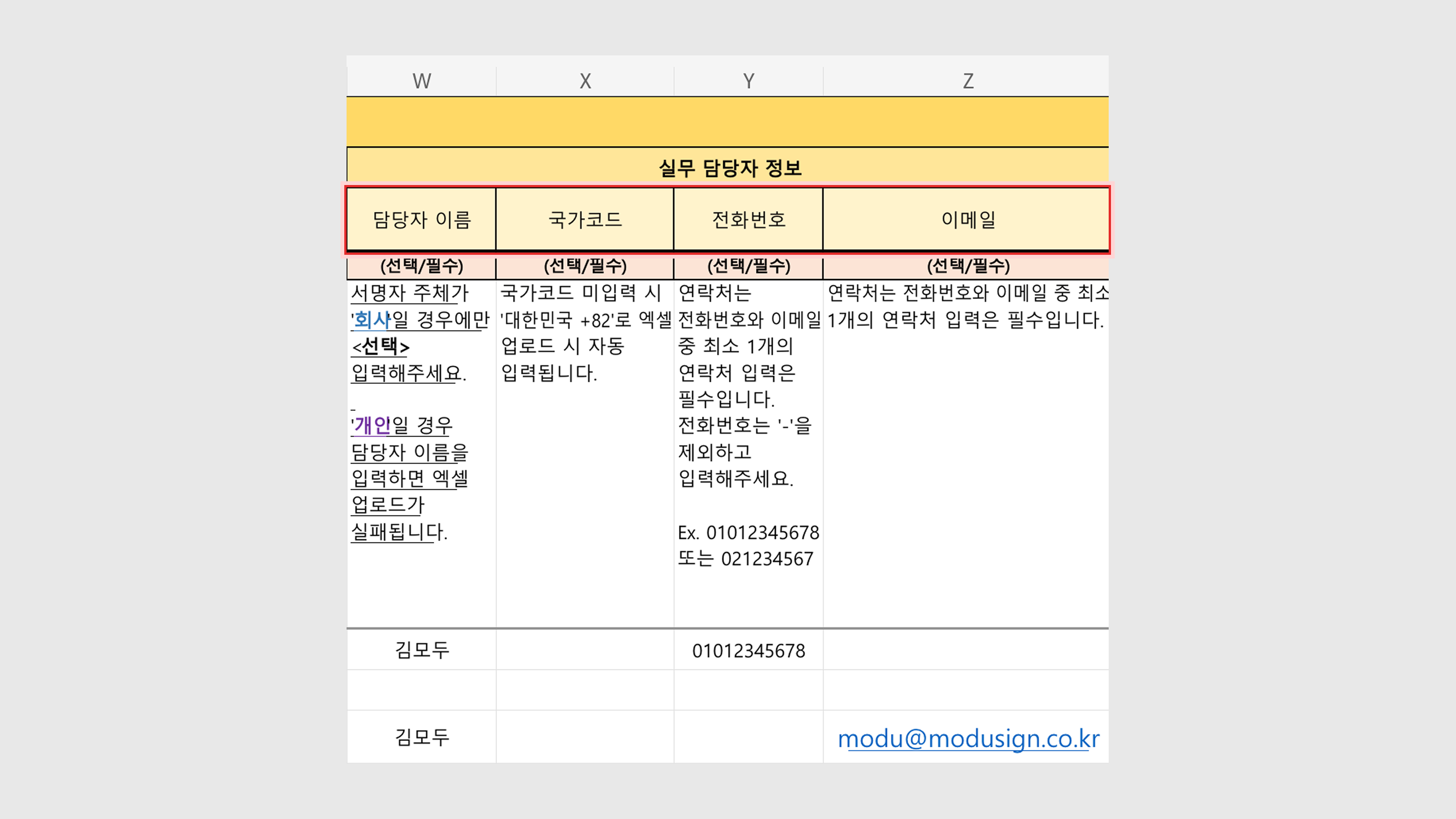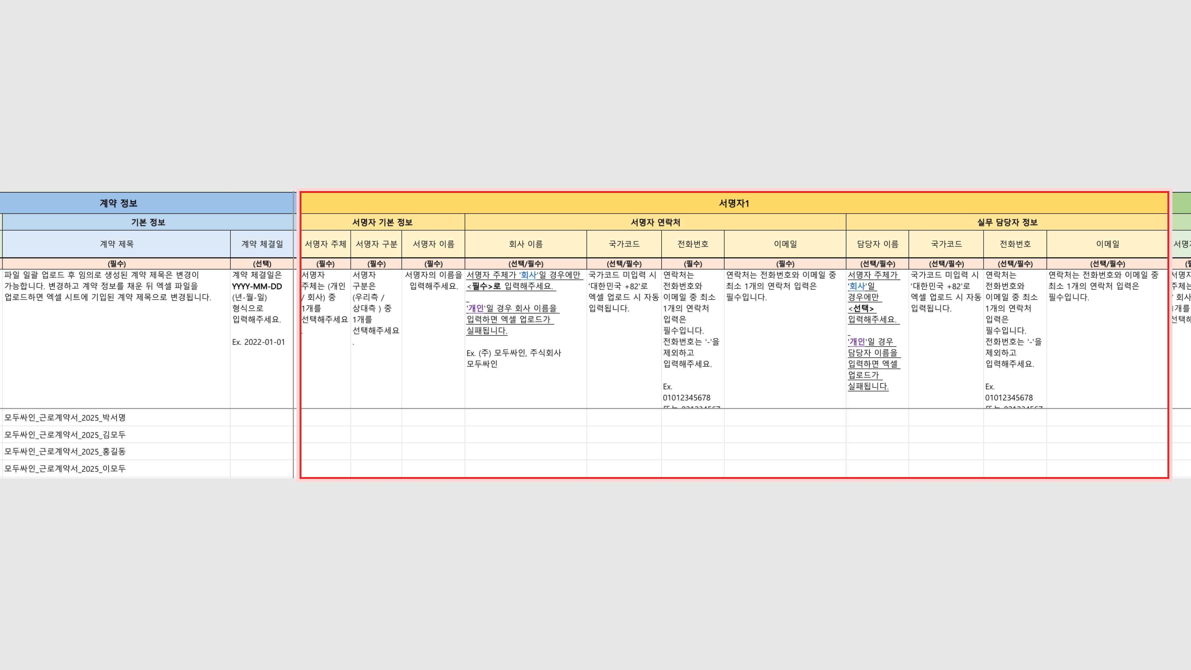 담당자 이름 : 서명자 주체가 회사일 경우에 한해 담당자 이름을 선택 입력합니다. 서명자 주체가 개인일 경우, 입력하면 업데이트가 진행되지 않습니다.