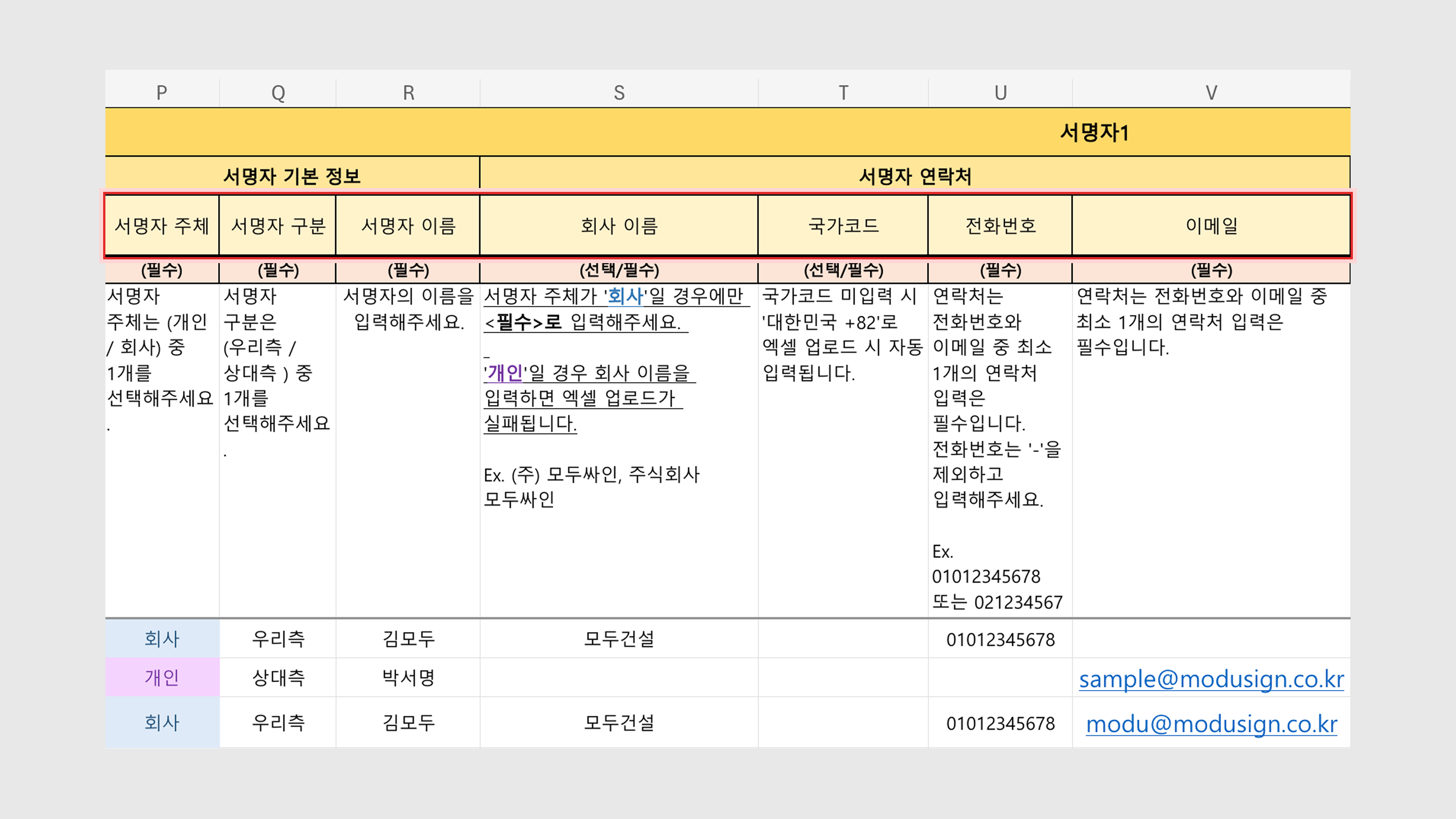 서명자 전화번호 / 이메일 : 서명자의 이메일 혹은 전화번호 중 최소 한 개의 연락처를 필수로 입력합니다.