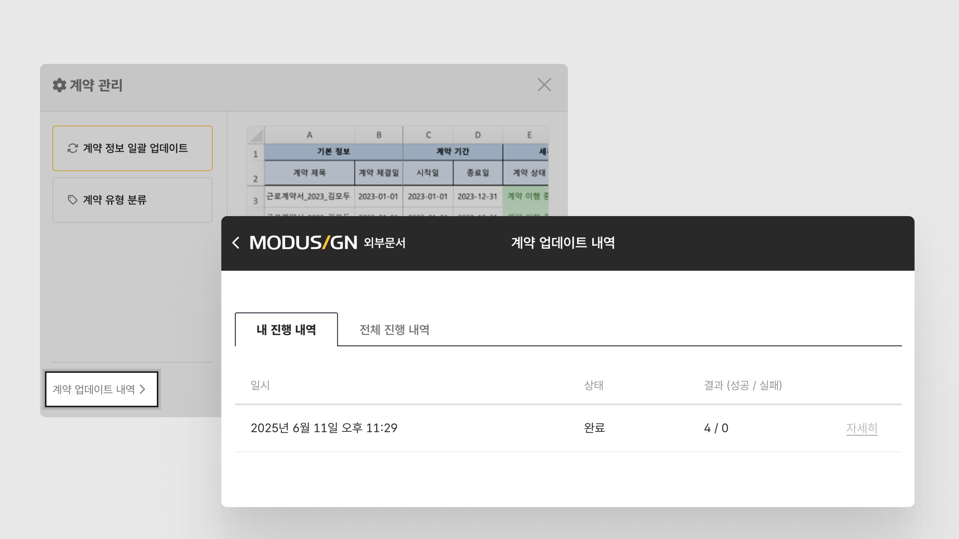 [계약 관리] 의 계약 업데이트 내역에서 설정용 엑셀 파일의 업로드 내역을 확인할 수 있습니다.