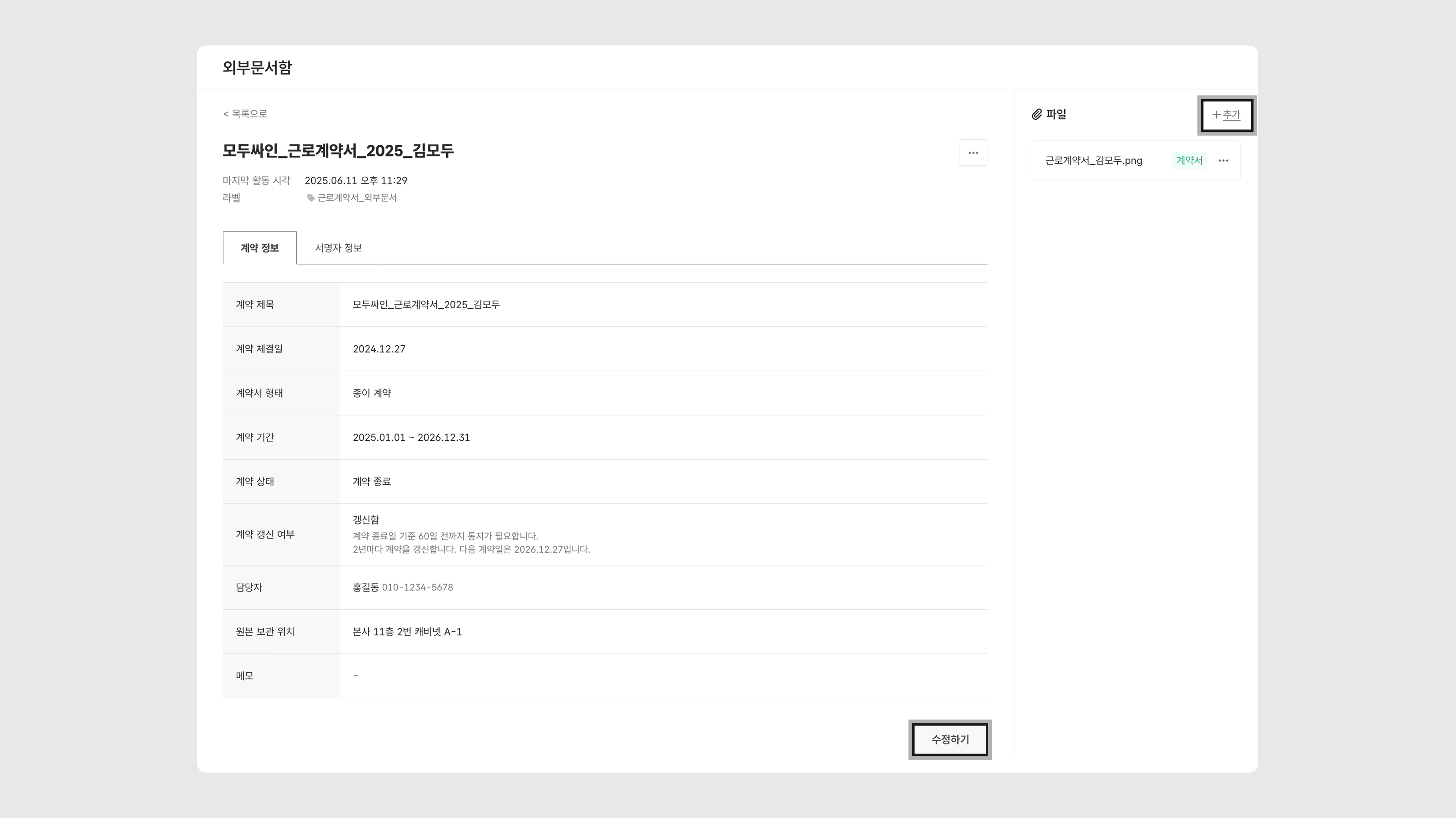 수정할 외부문서 클릭 > [수정하기] 버튼으로 계약 및 서명자 정보를 수정할 수 있습니다.