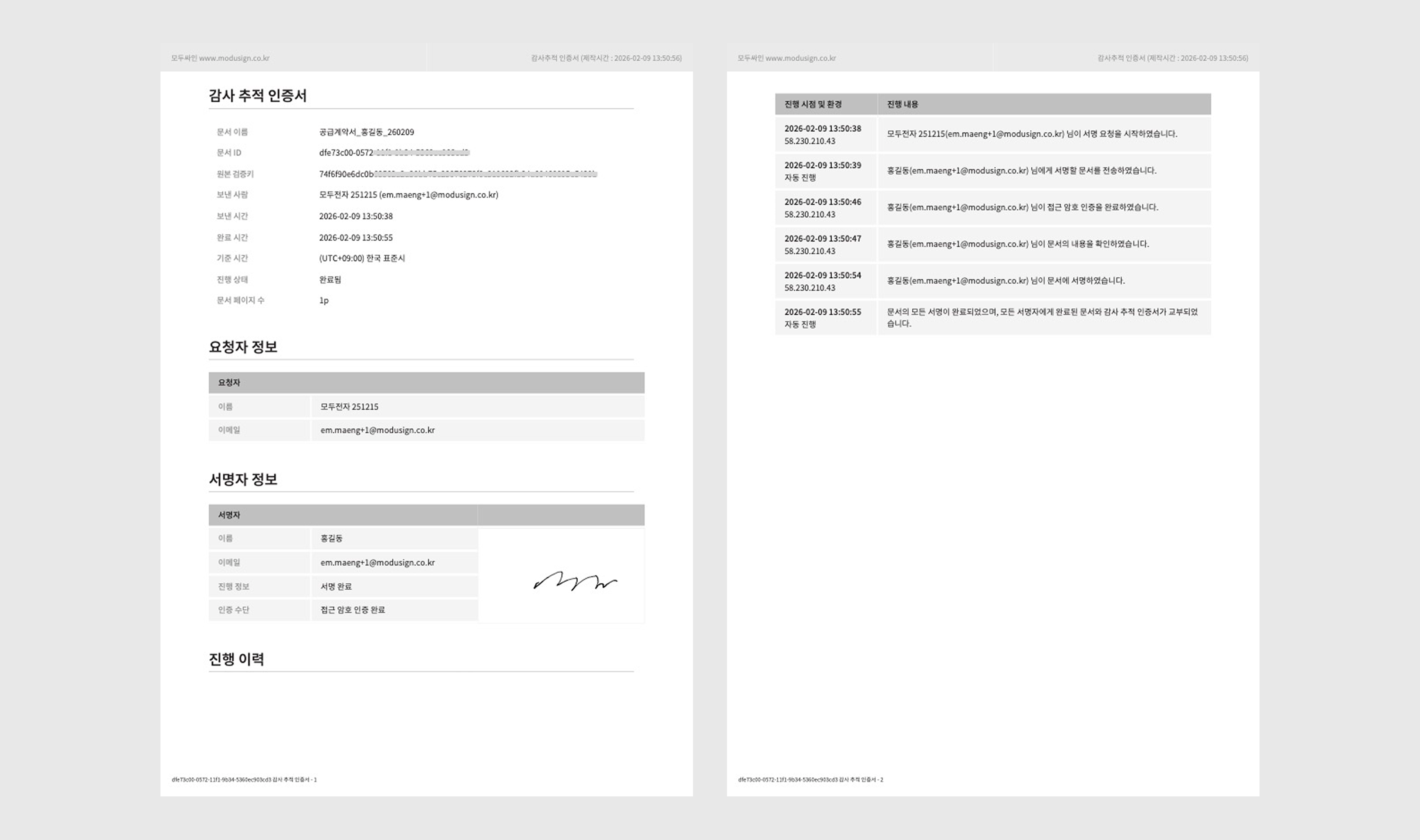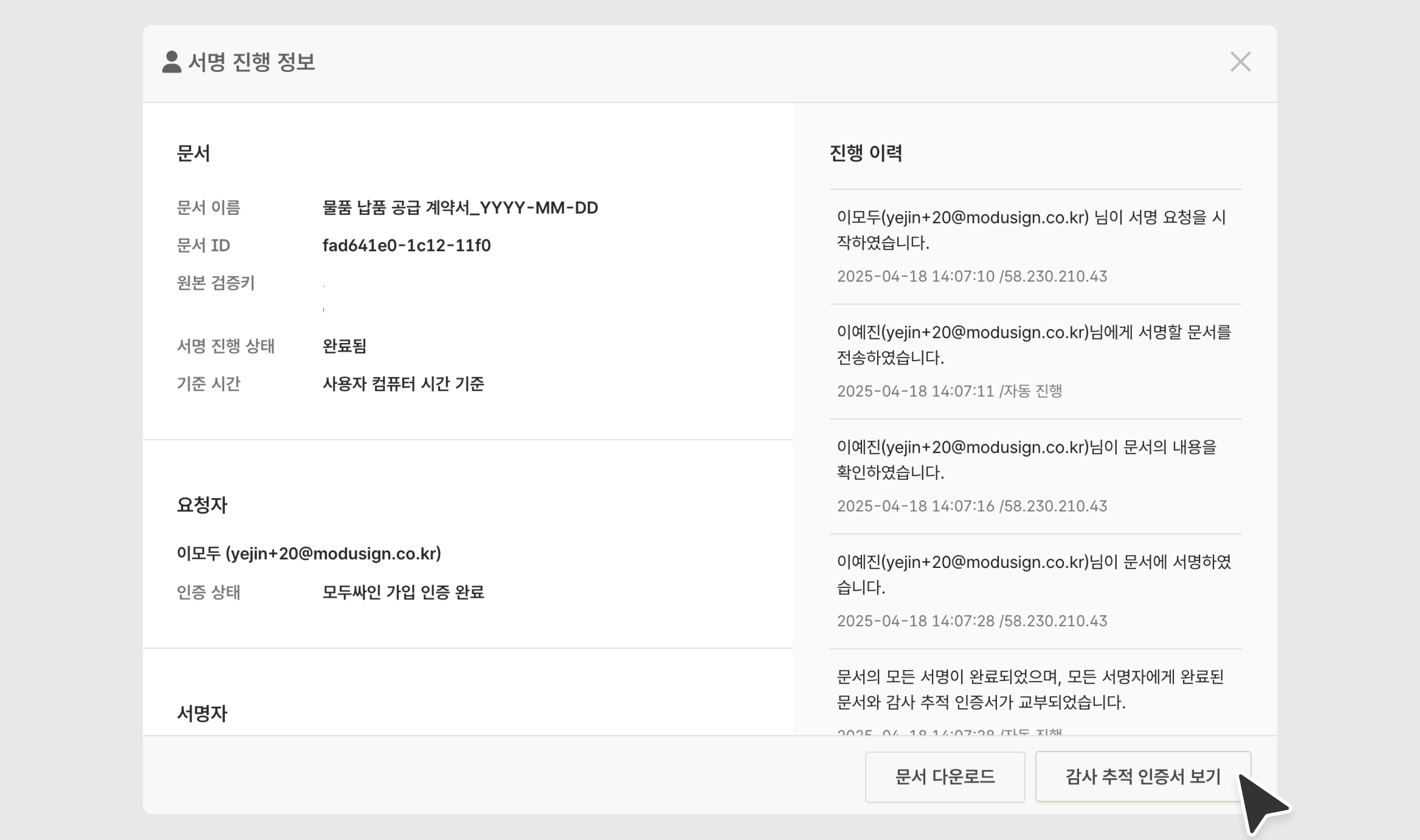 • 전자계약 진행에 대한 모든 이력과 시간, IP주소와 서명 요청자, 서명자, 문서 정보를 포함합니다.