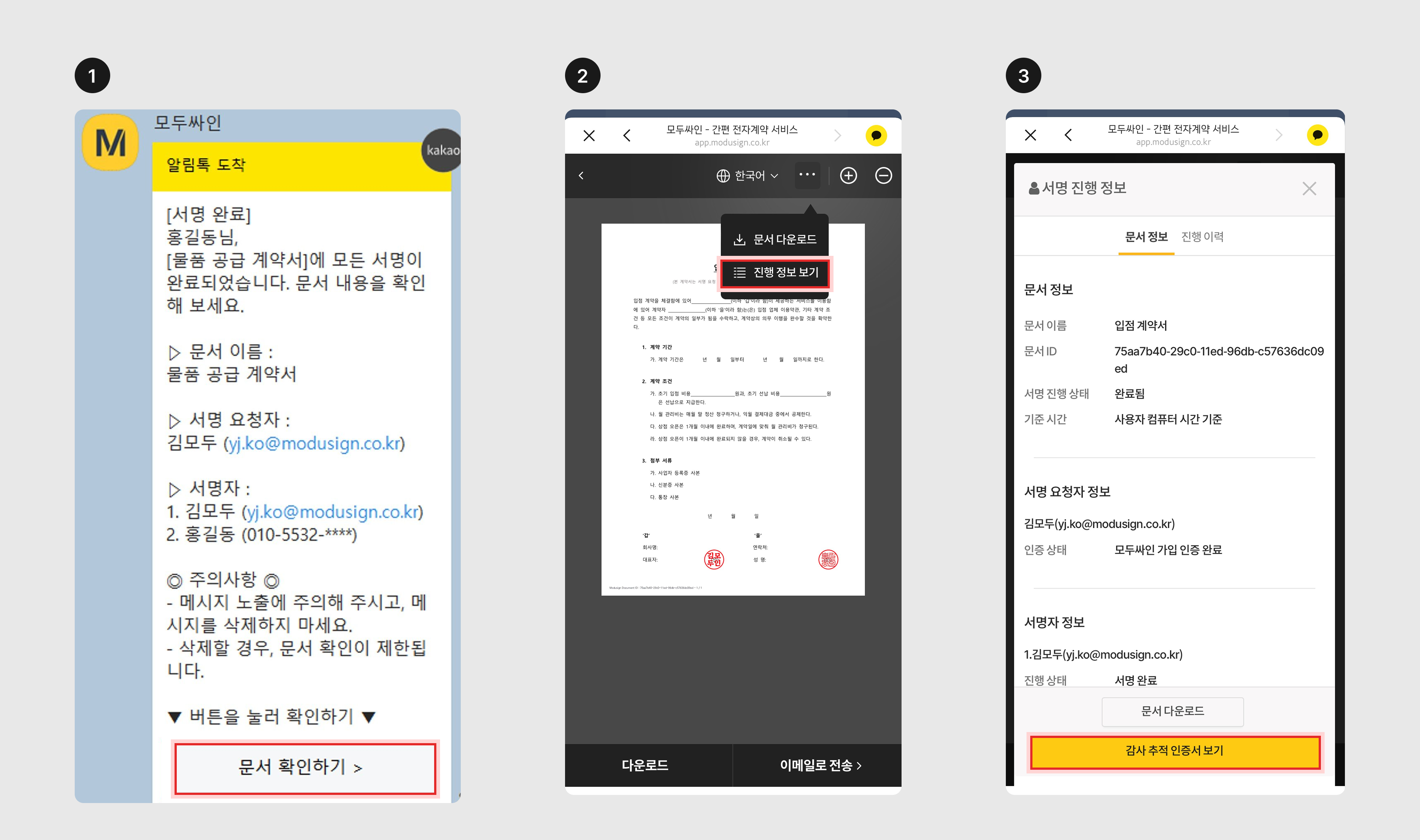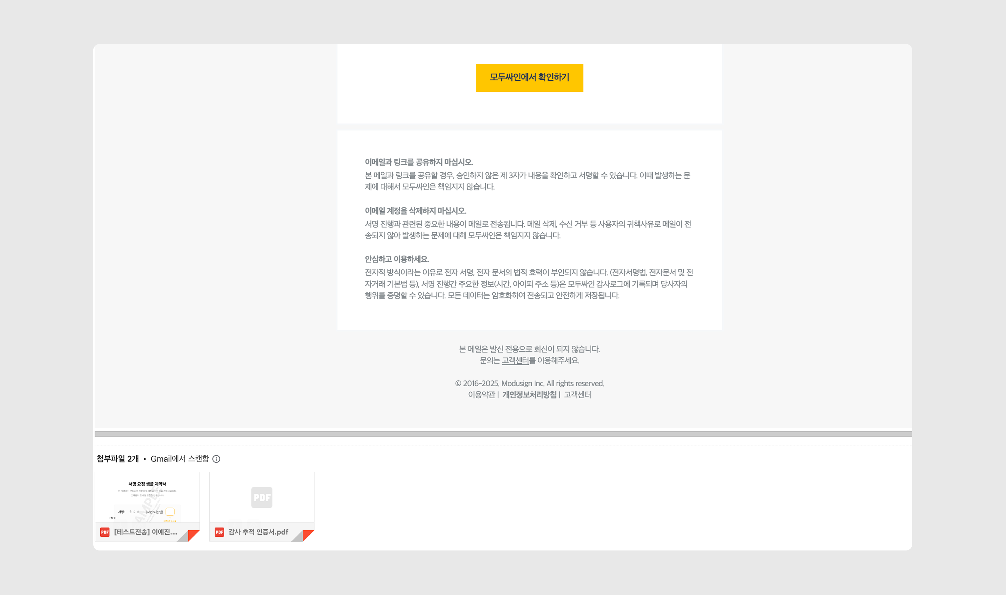 2. 계약 완료 메일을 열어 첨부된 감사 추적 인증서를 다운로드할 수 있습니다.