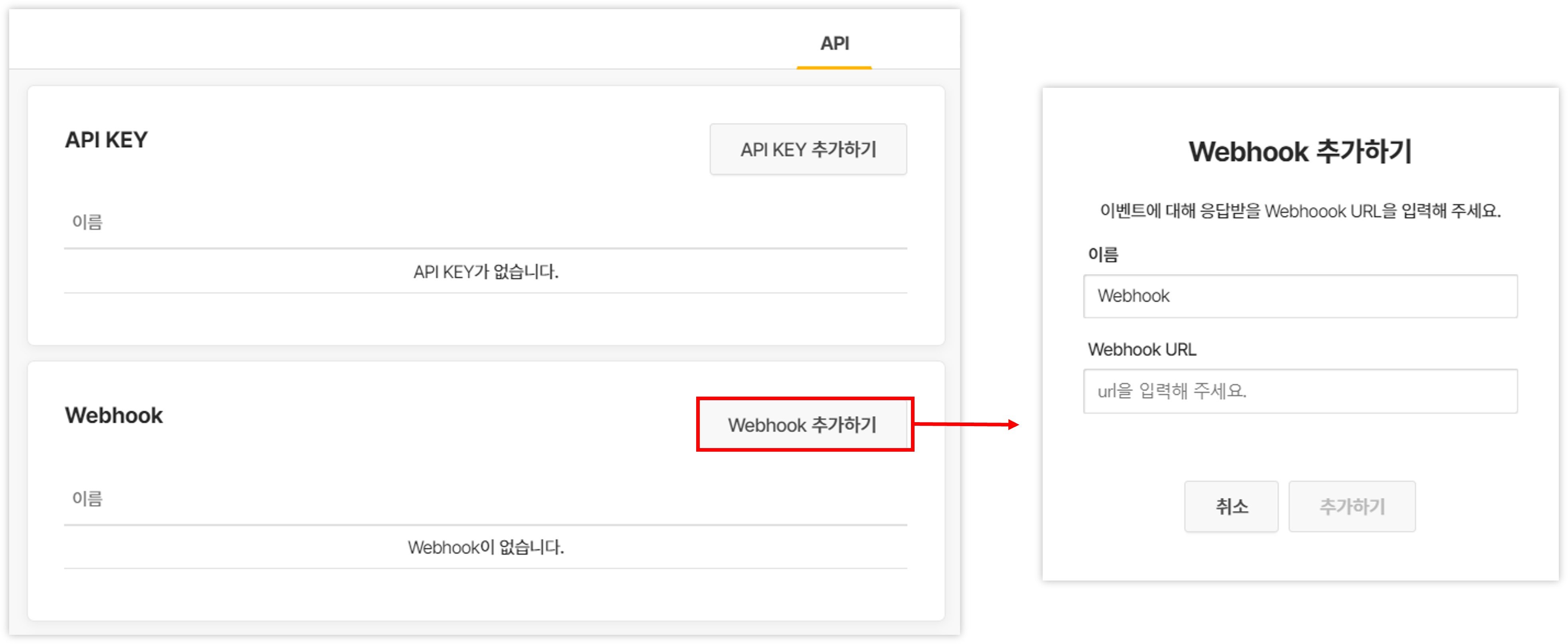 API 연동 및 웹훅 설정이 필요하신 경우, 문의하기를 눌러 폼을 제출해주시면 전문 컨설턴트가 자세한 안내를 도와드리겠습니다. (문의하기 >)