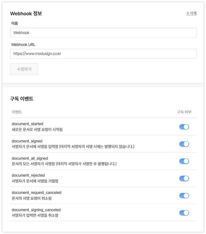 Webhook URL을 수정하거나 이벤트별로 구독 여부를 설정할 수 있습니다.