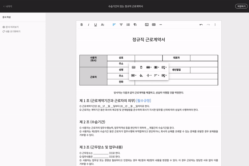 1. 서식 편집 기능을 통해 해당 서식을 편집할 수 있습니다. 상단의 [저장하기]를 클릭하여, 편집 형태를 저장할 수 있습니다.