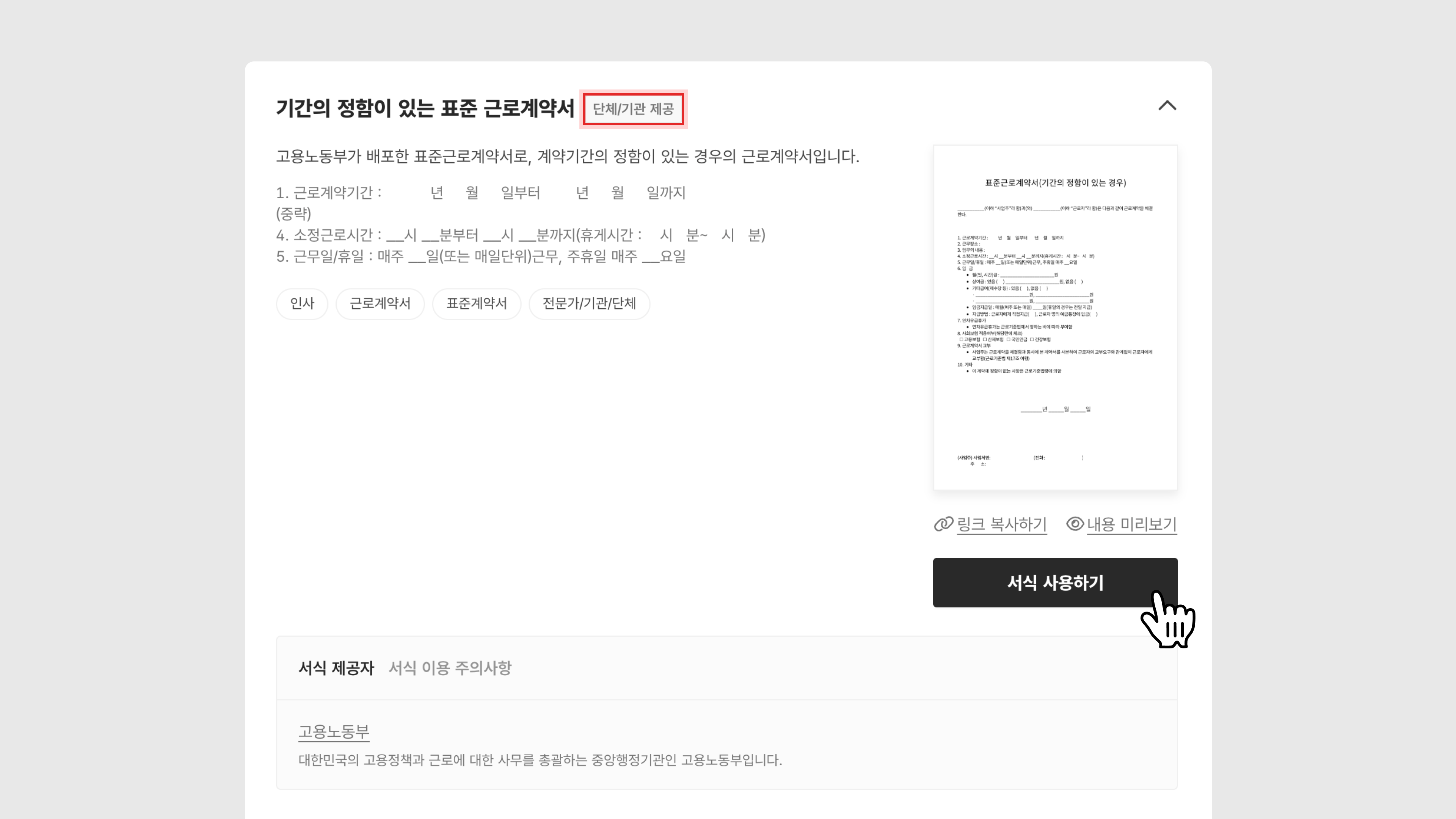 • 단체/기관 제공 : 고용노동부 등 행정기관에서 제공한 서식