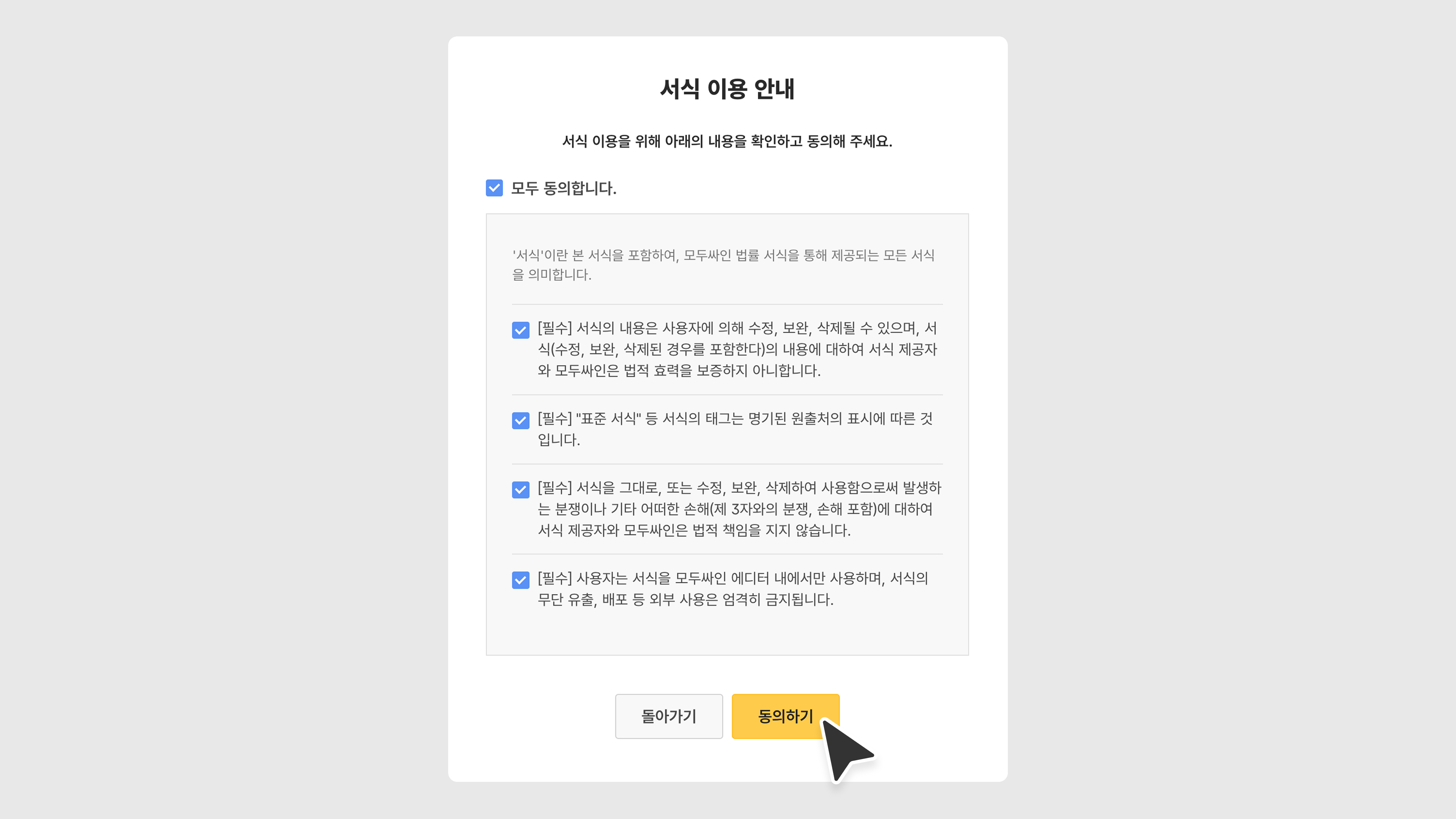 서식 이용 안내 동의는 최초 이용 시에만 진행돼요.