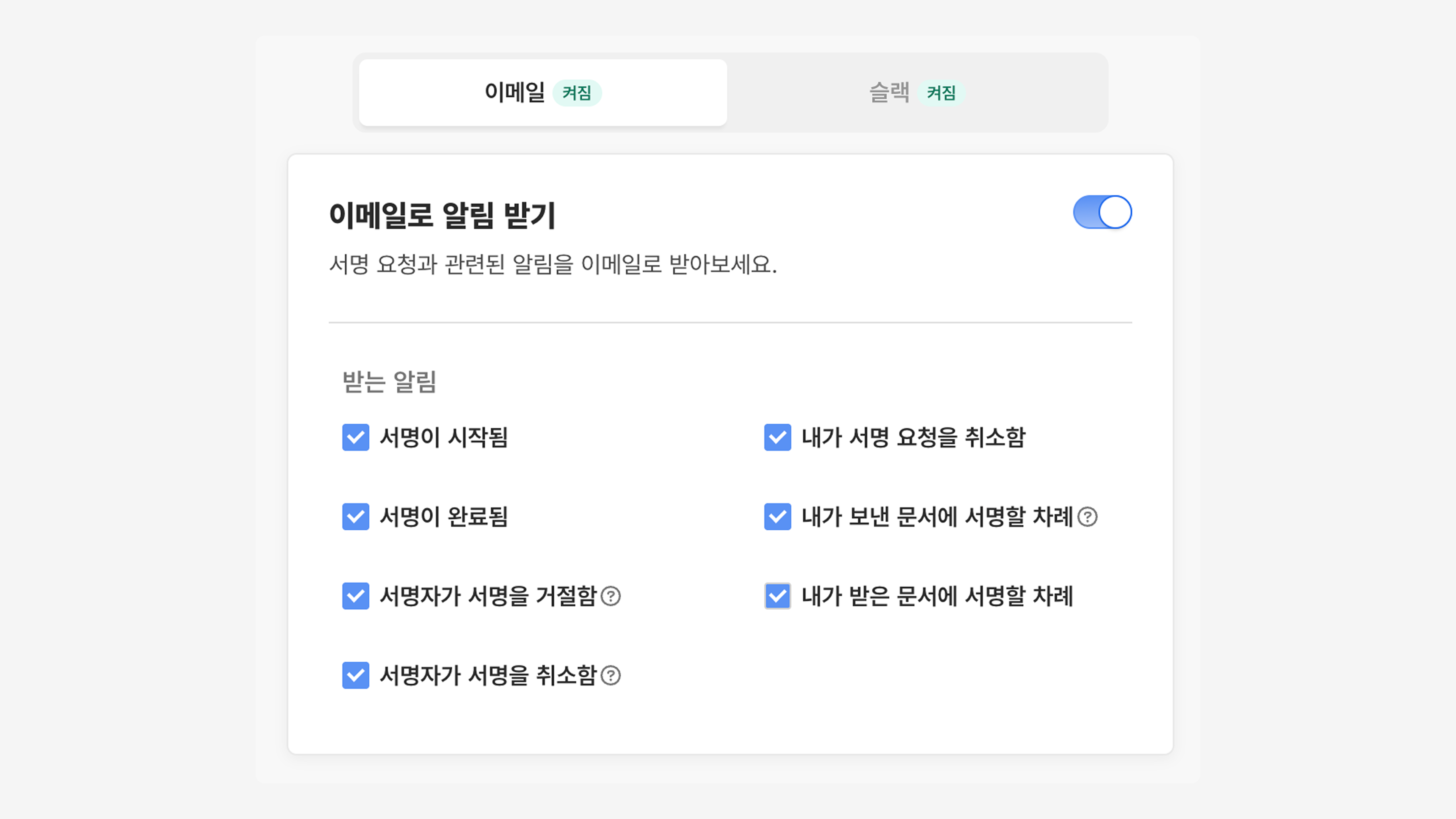 '이메일, 슬랙' 알림 수단의 On/Off 설정이 가능합니다. 서명 요청 알림의 세부 설정은 이메일 알림과 슬랙 알림에 공통으로 적용됩니다.