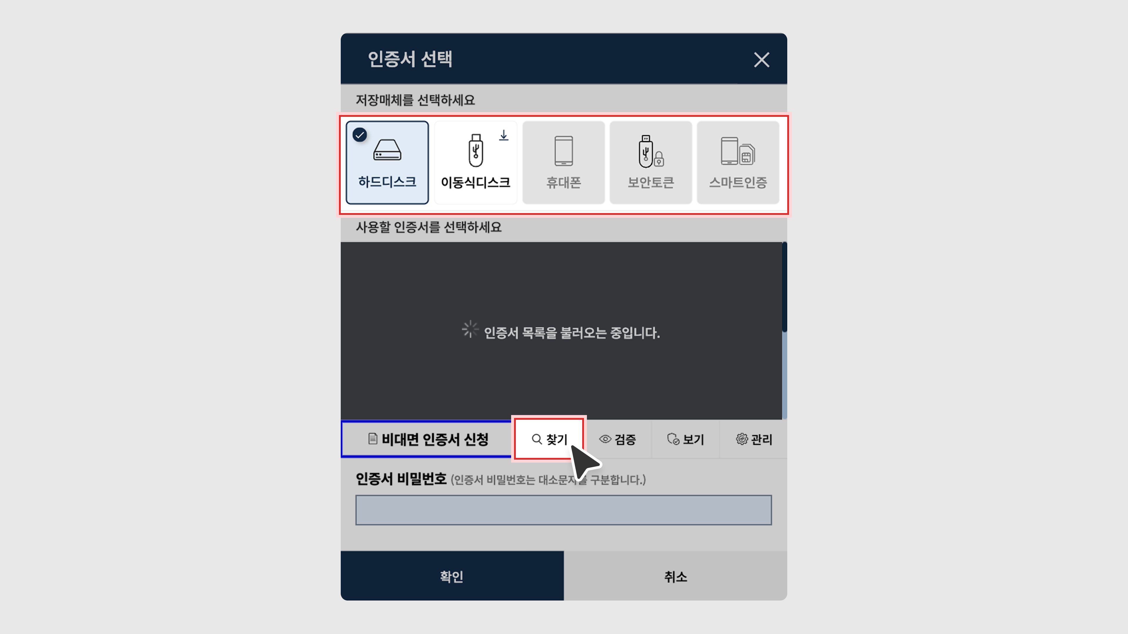 인증서가 저장된 저장 매체 선택 후 화면 하단의 [인증서 찾기] 버튼을 클릭합니다.