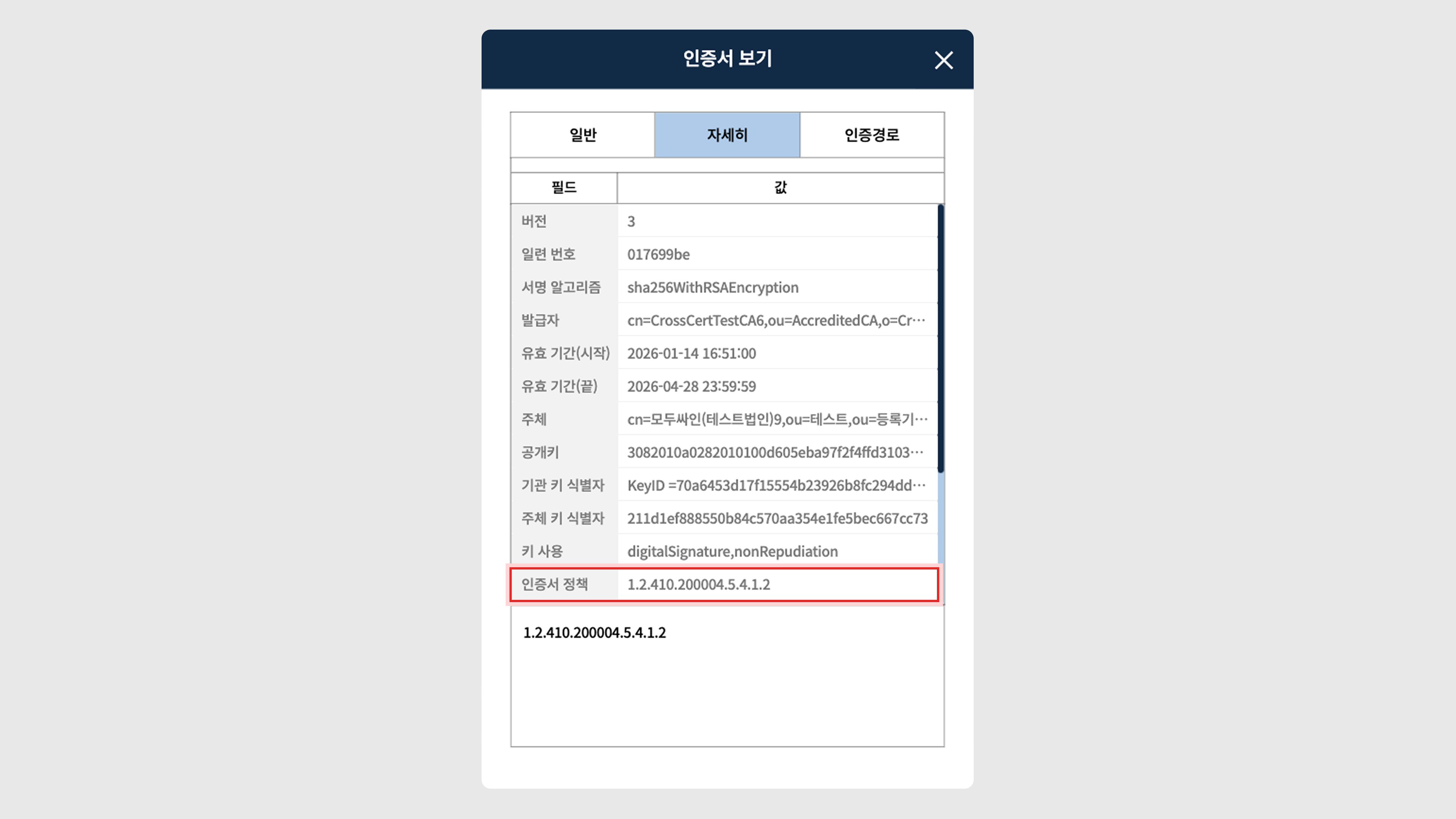 인증서 보기 > 자세히 > 보유한 인증서의 [인증서 정책]을 확인 후, 모두싸인에서 이용 가능한 인증서 목록에 있는지 확인합니다.