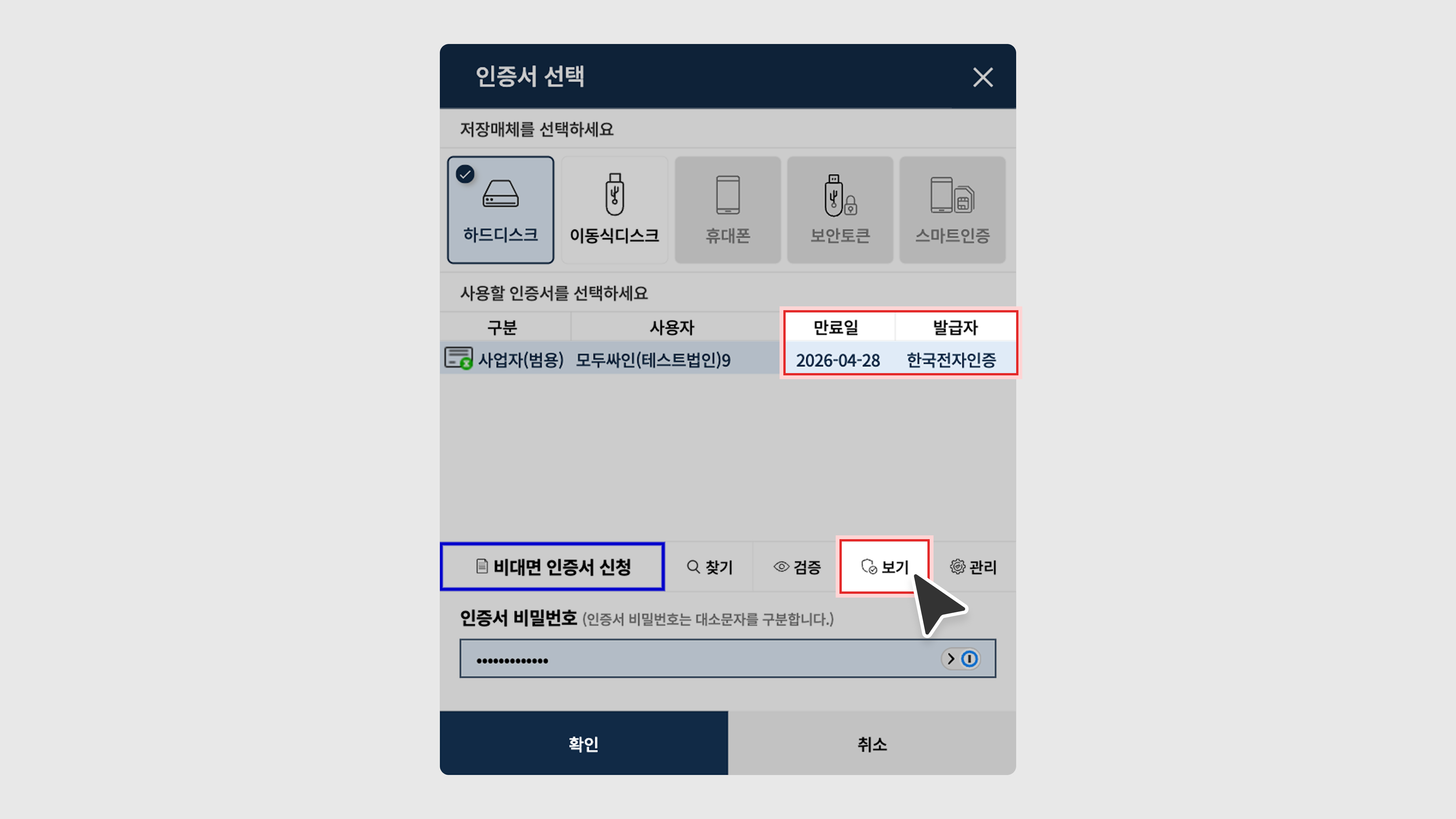 가져온 인증서의 발급기관과 만료 일자 확인 후, 하단의 [보기]를 클릭합니다.
