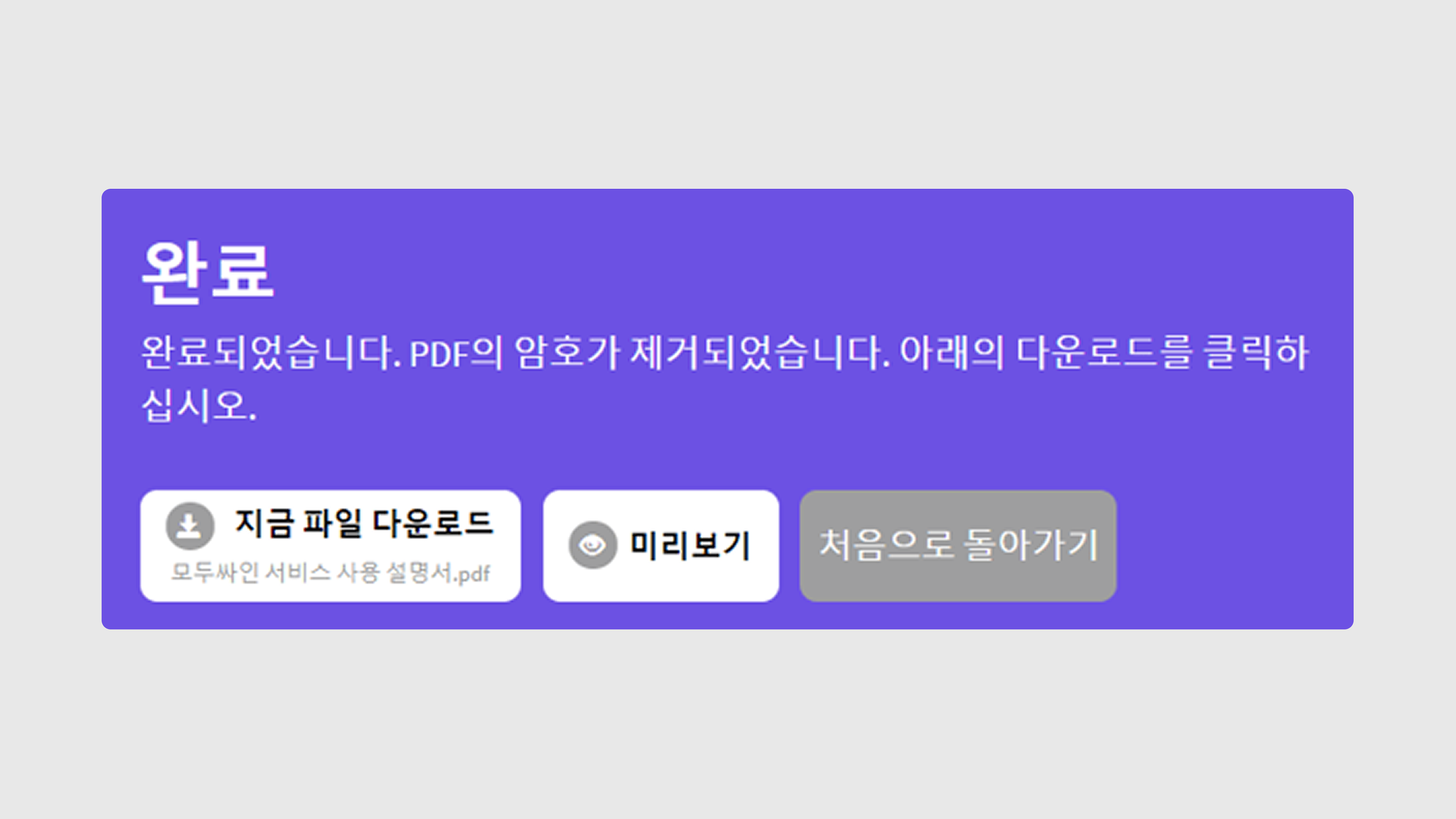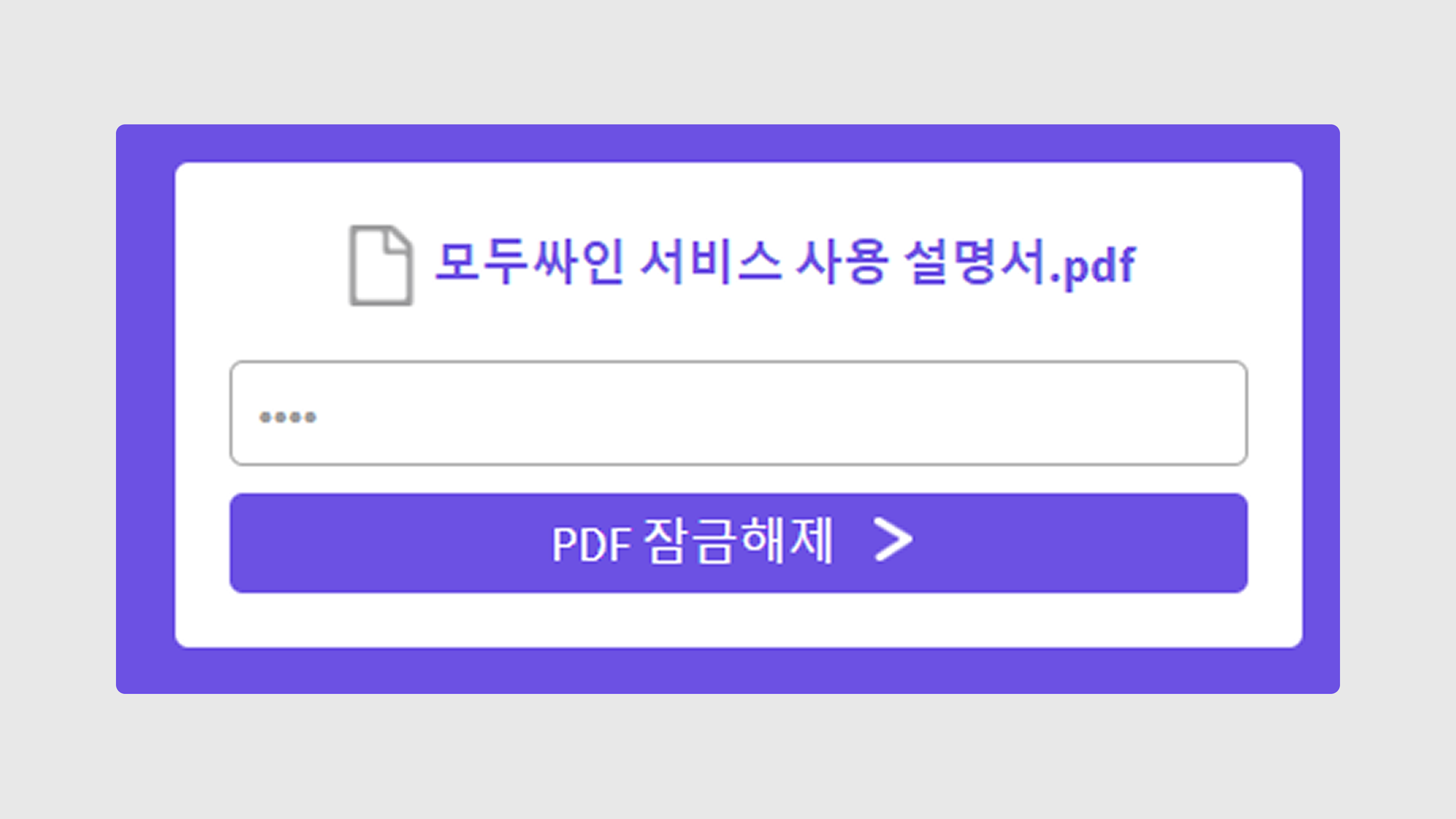 잠금이 해제된 PDF파일이 제공되었습니다. 해당 파일을 원하는 공간에 저장한 후, 모두싸인에 잠금이 해제된 PDF 문서를 올려 서명 요청을 진행합니다.