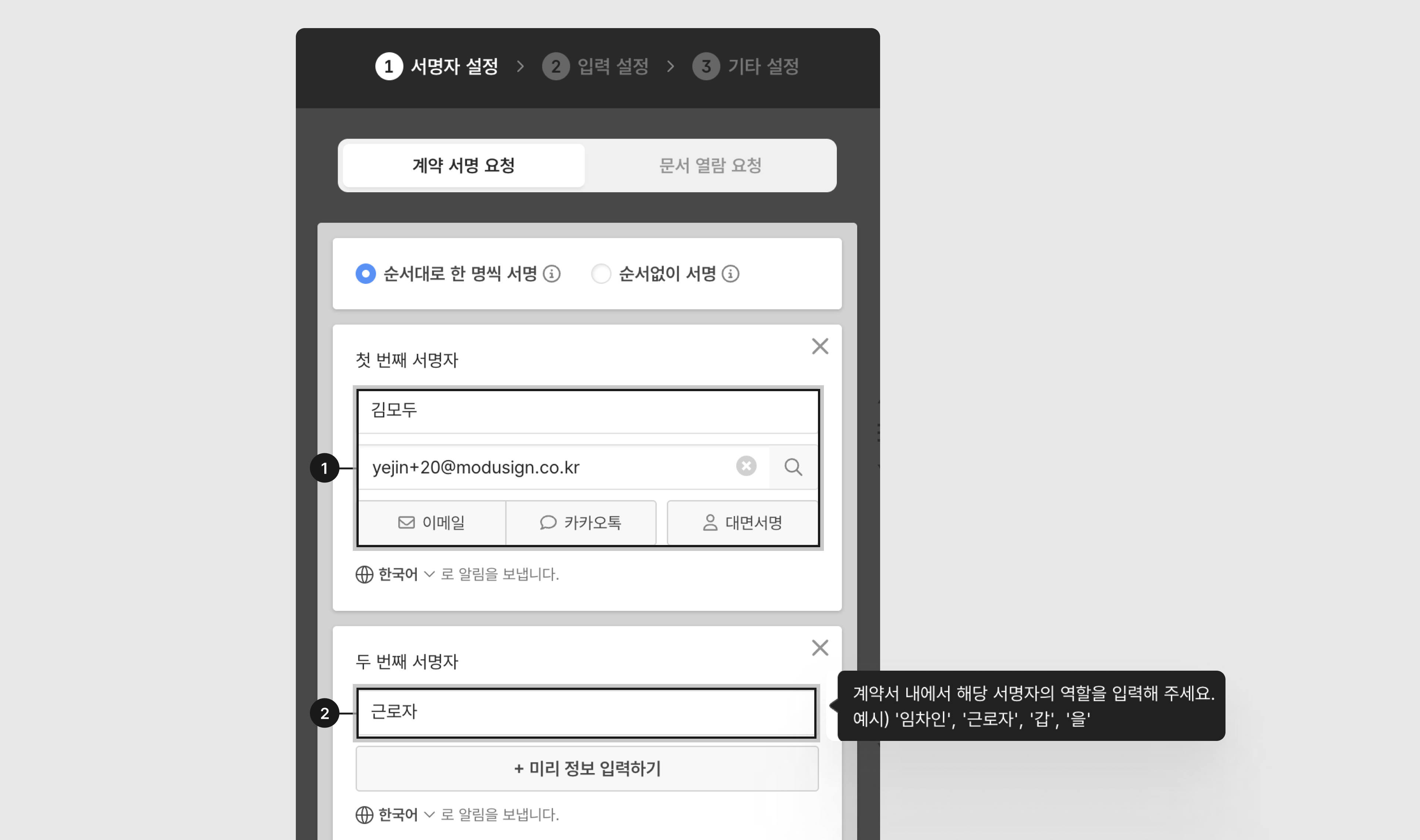 서명자 설정 단계에서 서명자에 대한 정보를 미리 설정할 수 있습니다. 문서에 서명자들이 각 어떤 역할을 할 예정인지 역할을 입력합니다.