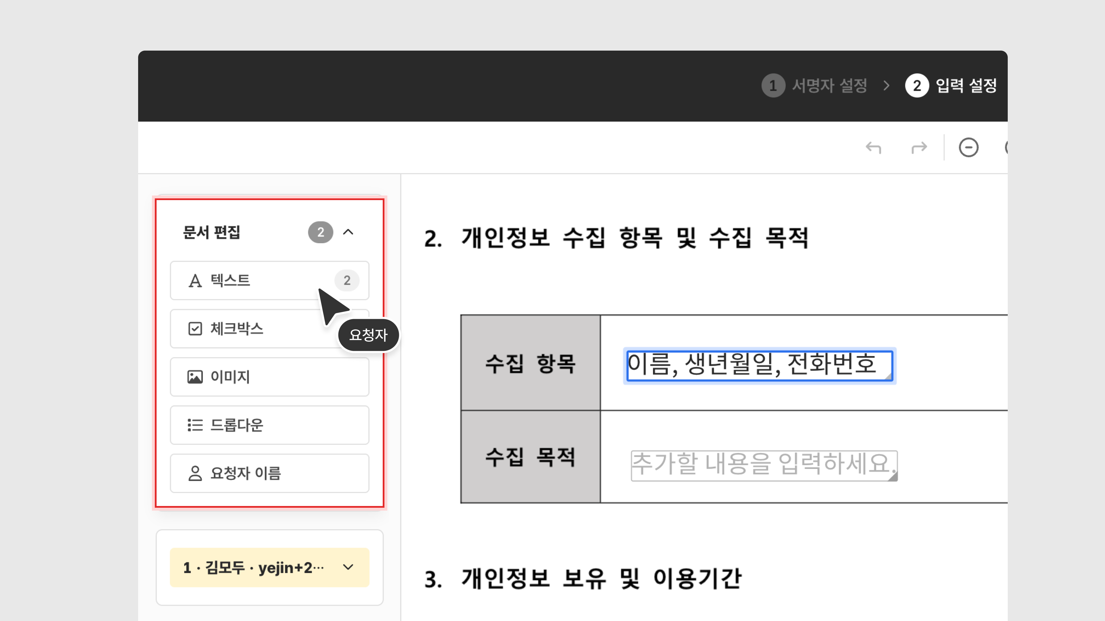 입력 설정 단계에서 요청자가 문서에 입력할 내용은 문서편집의 텍스트를 통해 미리 내용을 작성하고, 서명자의 입력란을 미리 설정할 수 있습니다.