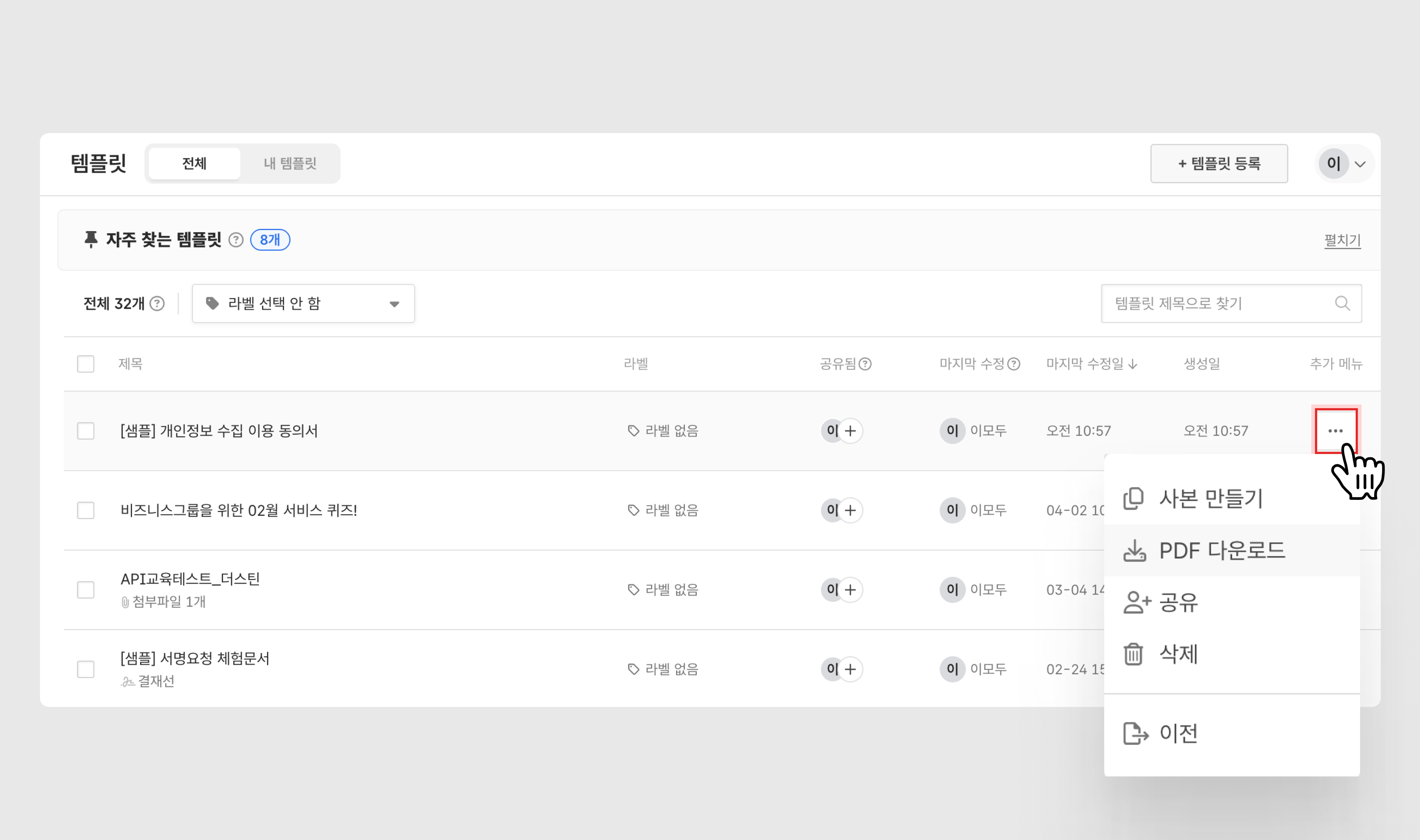 • 해당 템플릿에 열람 권한이 있는 멤버는 PDF 다운로드가 가능해요.
