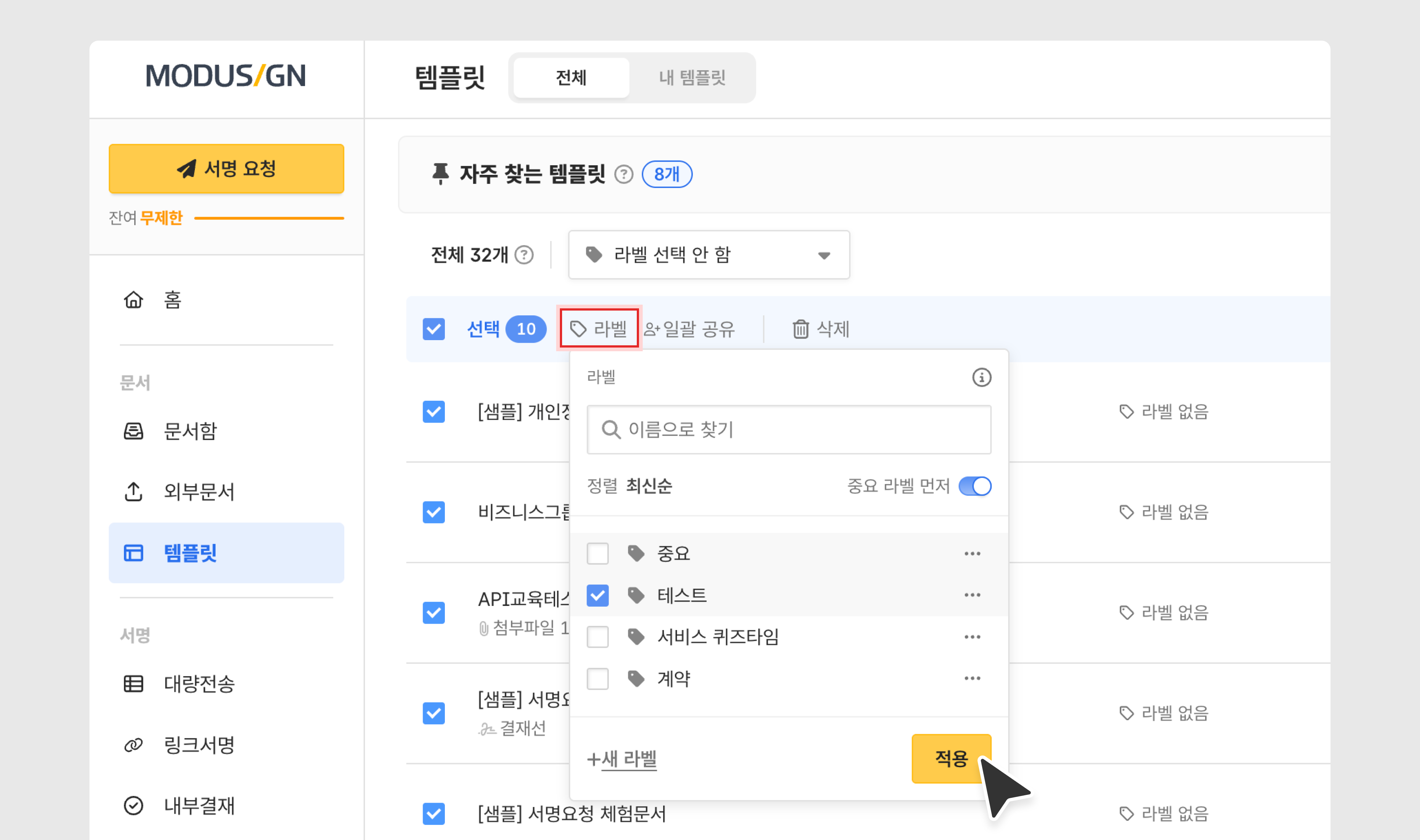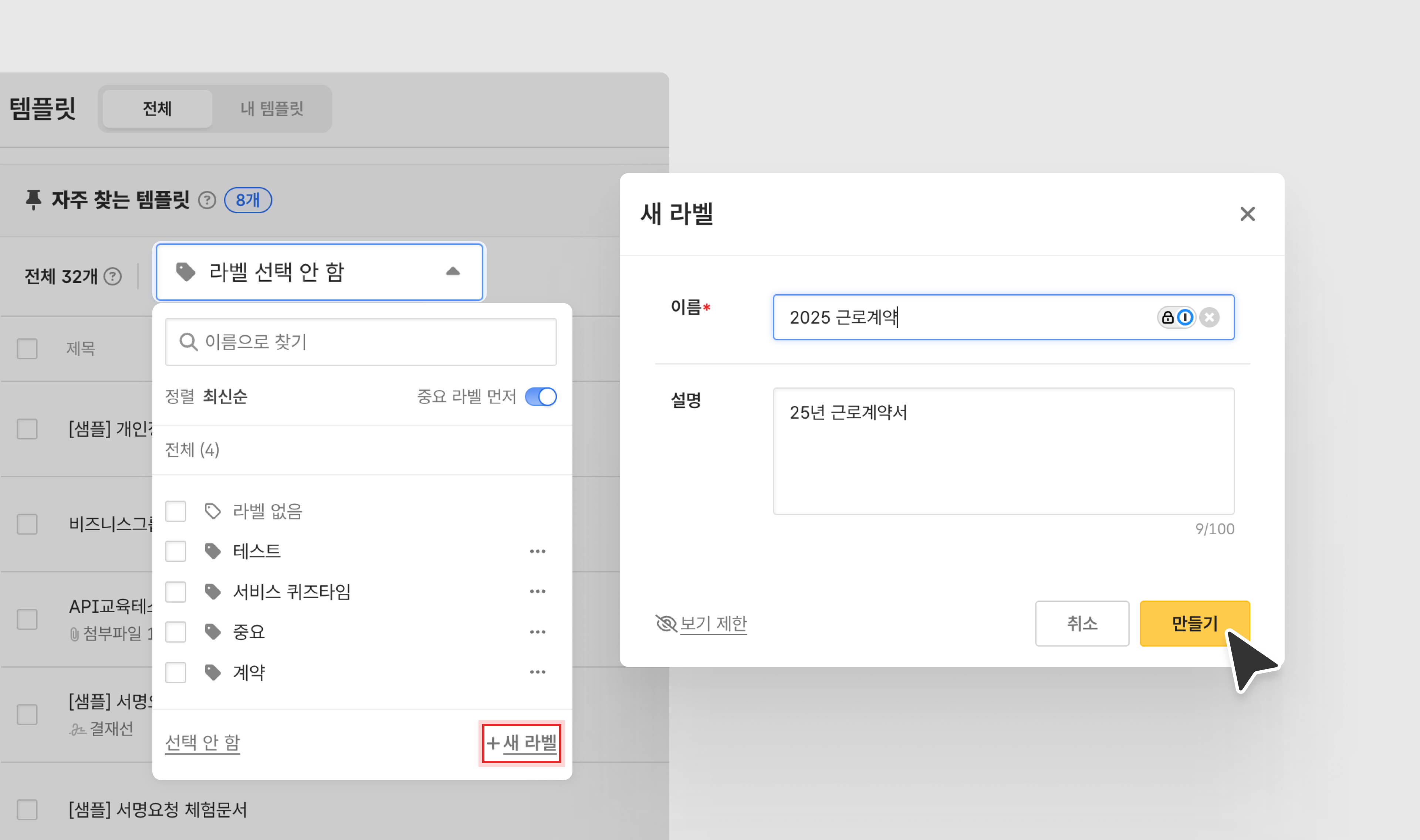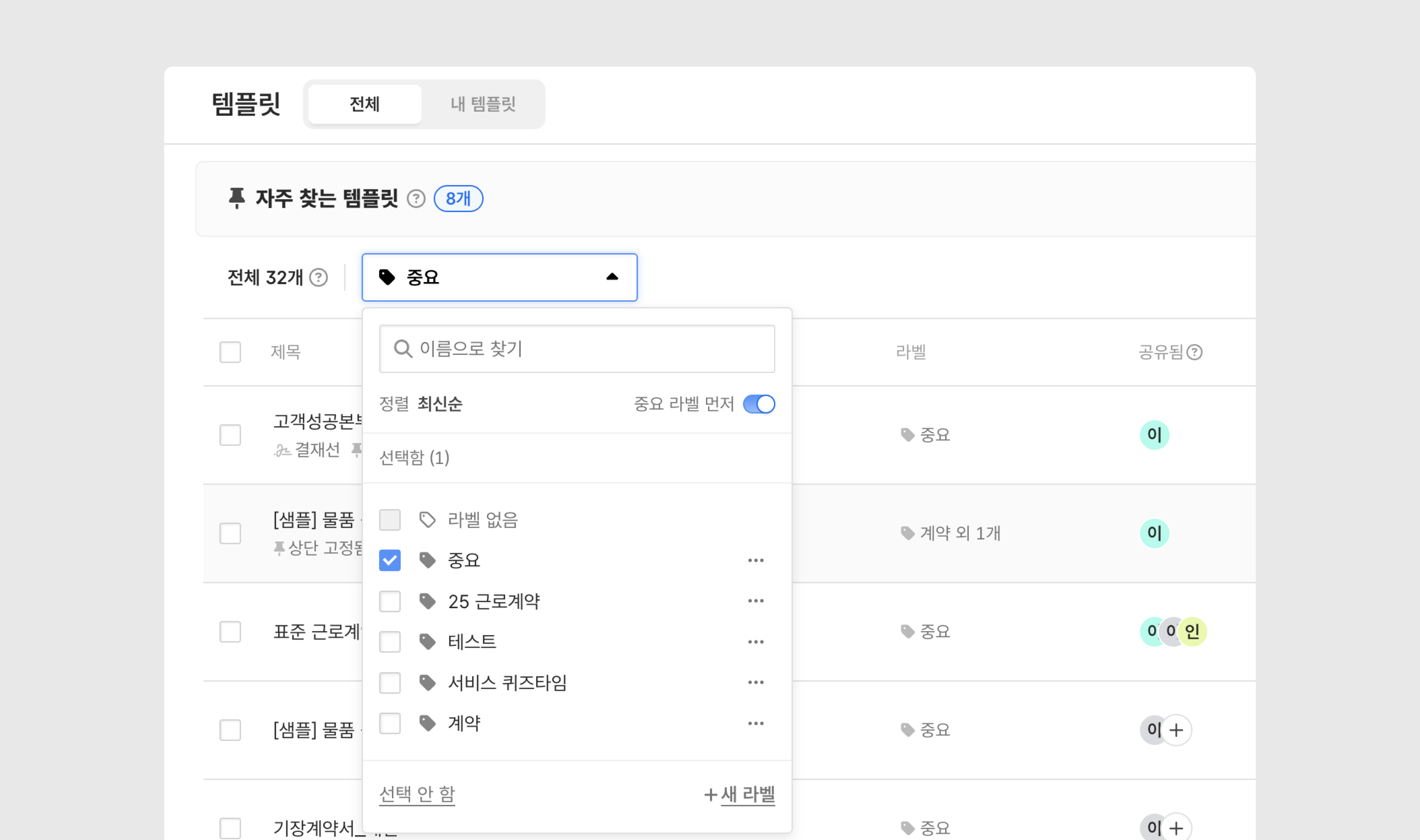 • 기존에 문서함에서 생성했던 라벨을 템플릿에도 적용할 수 있습니다.