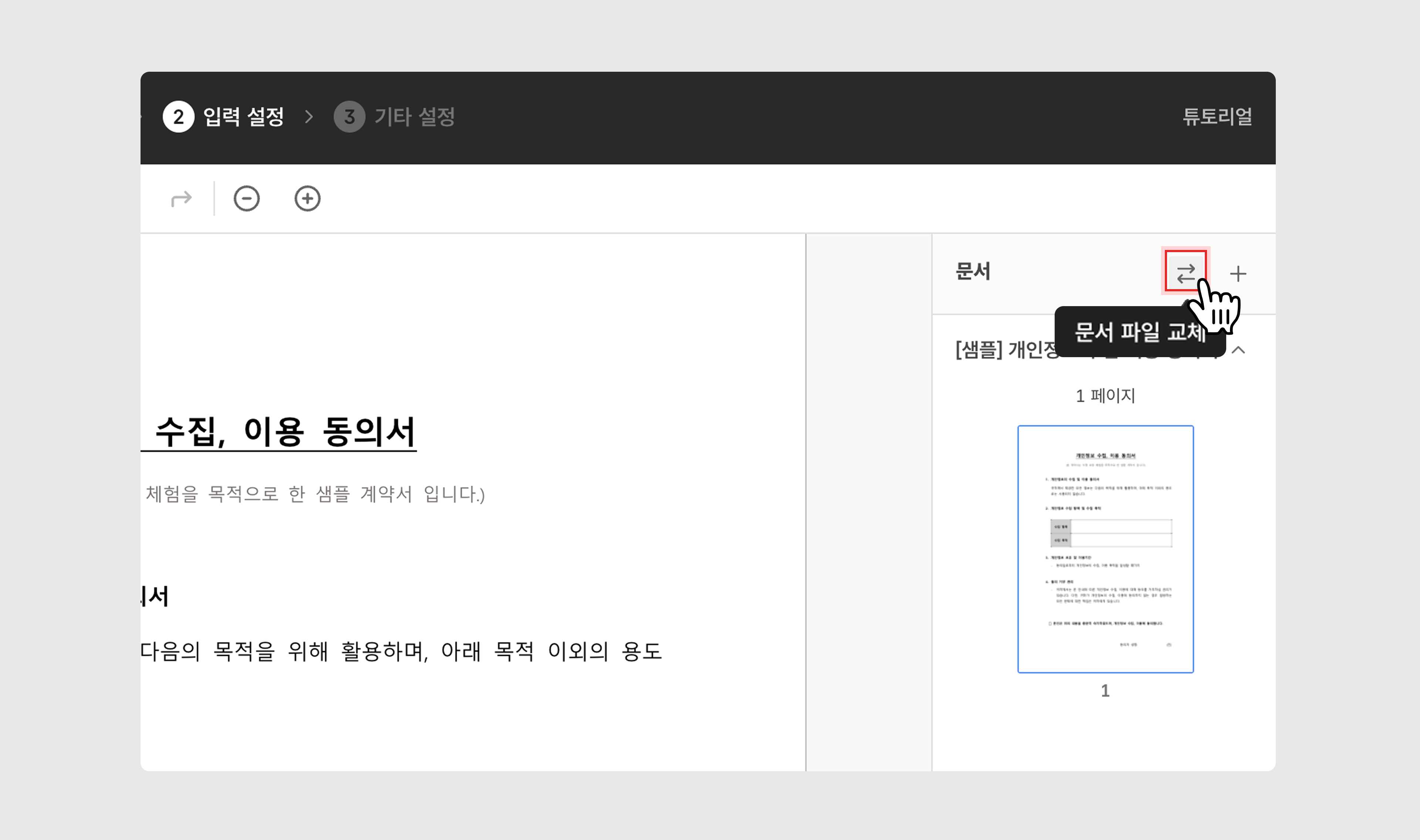 • [템플릿] 메뉴 > [+템플릿 등록] 또는 기존 템플릿을 클릭 후 [내용 확인 및 수정] 버튼 클릭 > 입력 설정 단계에서 화면 우측 상단의 [문서 파일 교체] 버튼을 클릭