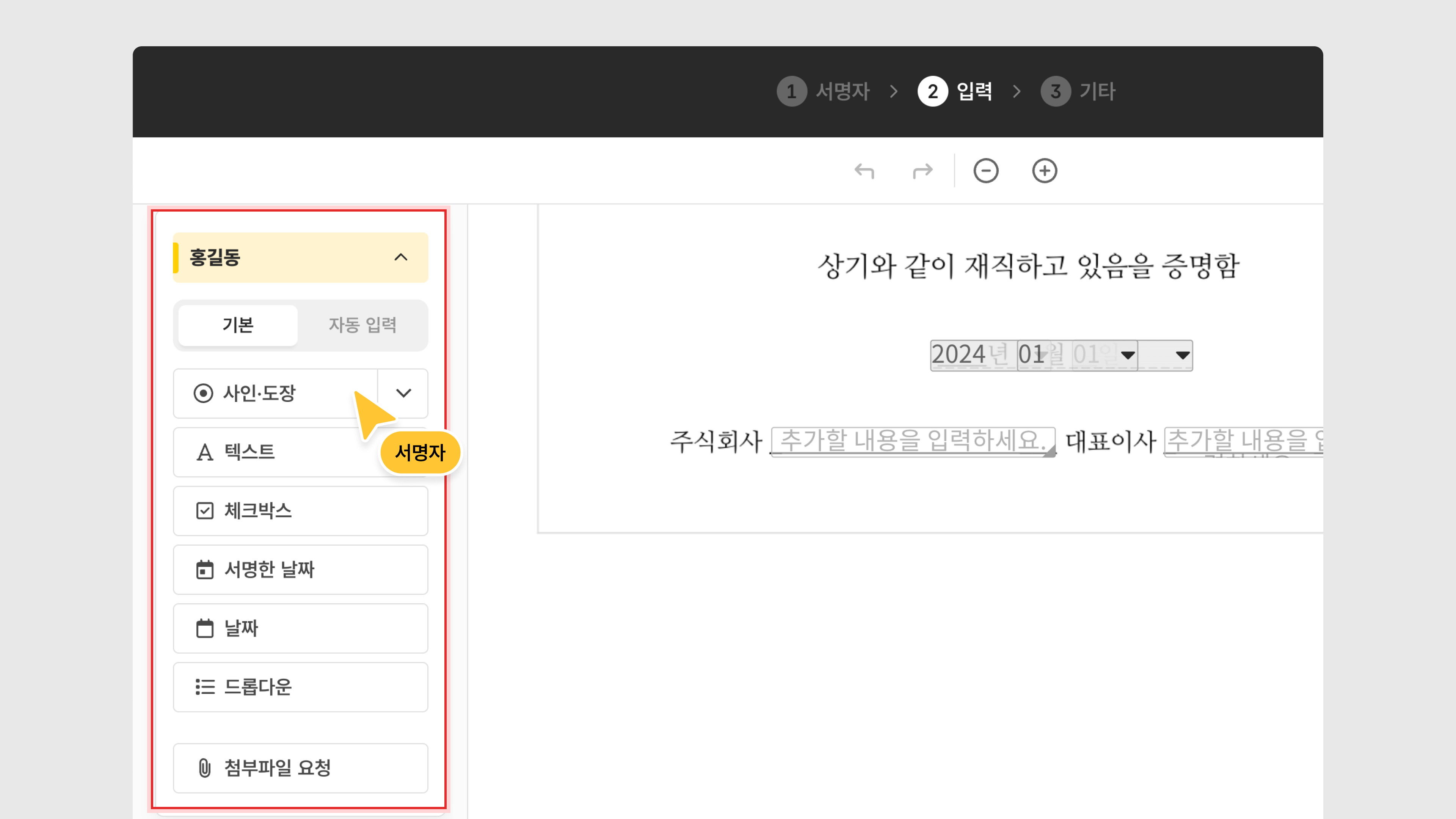 • 각 서명자들이 '직접' 입력할 텍스트, 사인/도장, 체크박스, 드롭다운 등의 위치를 미리 설정합니다. (입력란 이용 방법>)
